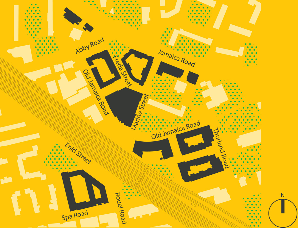 Bounded by railway lines on one side and the busy Jamaica Road on the other, the site was home to run down council buildings and disused car parks. A bomb site left over from the Blitz had become an adventure playground for local children. The one building of value that remained was the Grade II* listed St James’ Church, a local landmark that had remarkably survived the war unscathed.