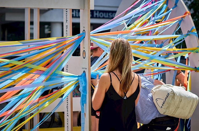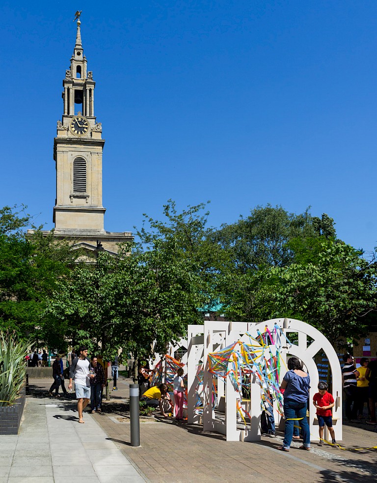 During the event, approximately 150 people joined us in Bermondsey Spa to share their knowledge and memories of the area. People were invited to answer a series of questions by tying a ribbon to the pavilion as they moved through the space. This gave them the opportunity to express how they felt, and what they knew or remembered about the area.