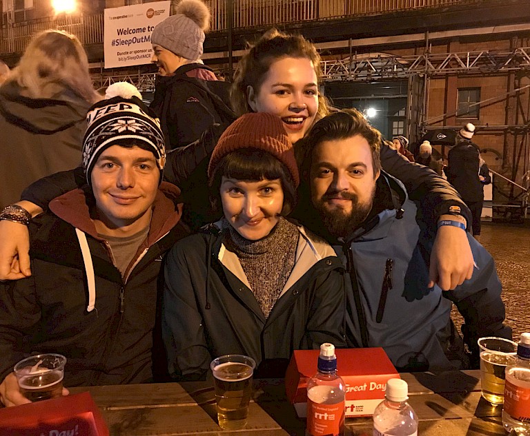 As we stuffed our sleeping bags away and traipsed bleary-eyed in the drizzle across the city to our warm, dry studio, our experience was put into perspective as we noticed the many homeless people we walked past. They had slept out in the rain last night, and possibly for many months of nights, whilst we had been undercover and watched over by a security guard. Centrepoint had also made sure we were well fed, entertained and merry ahead of our night sleeping on the stone floor.