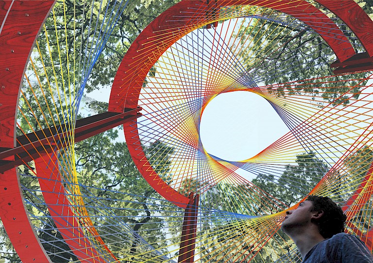 - The Next Generation Design Pavilion by Scale Rule, centred on the topic of sustainability. It was made up of layers of interwoven string which was designed to represent past, present and future. Its shaped was designed to focus the visitor’s eyes upwards towards the natural elements that surround the pavilion.