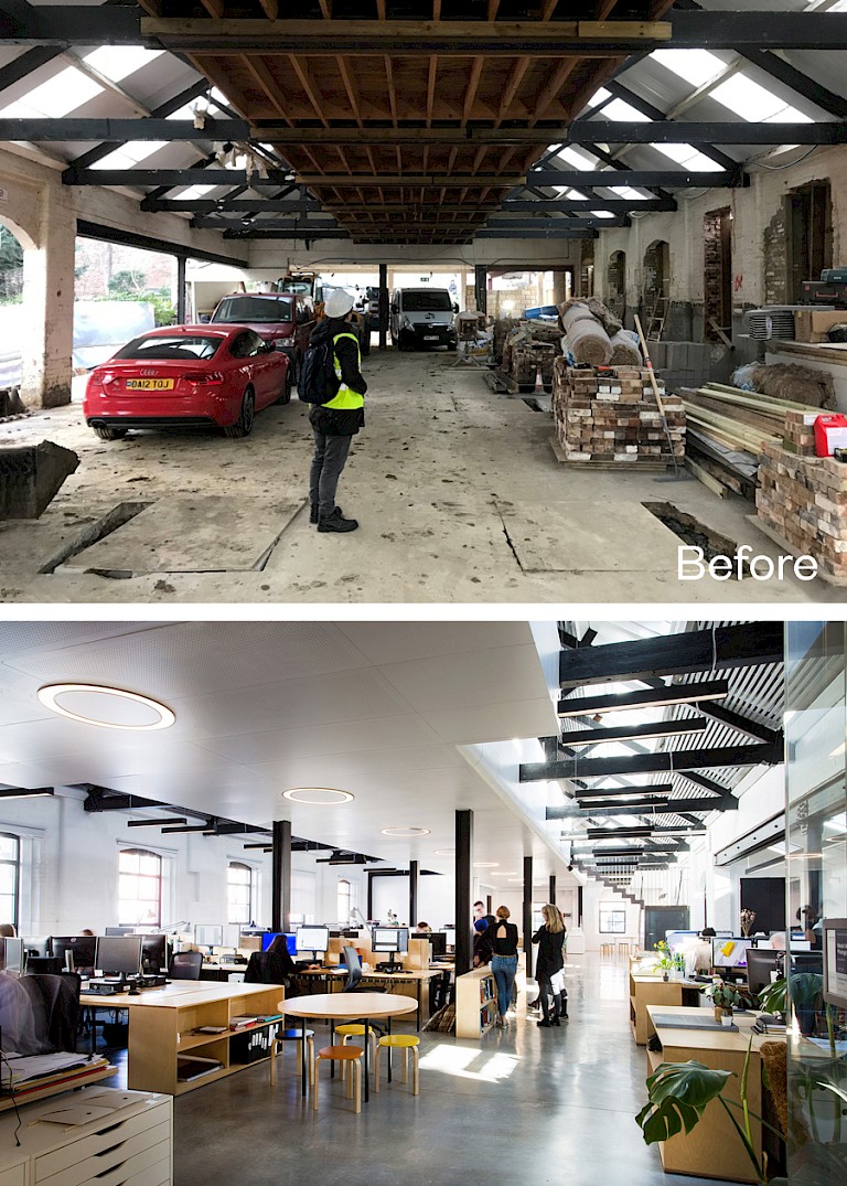 Thane Studios is naturally ventilated with automatically opening rooflights, with shading to prevent overheating. The concrete floor and exposed brick walls provide the thermal mass that helps moderate the internal environment. Phase 2 of the works – a transformative extension – completed in 2021 to create a new foyer at the front of the building as well as additional meeting space and a new landscaped forecourt.