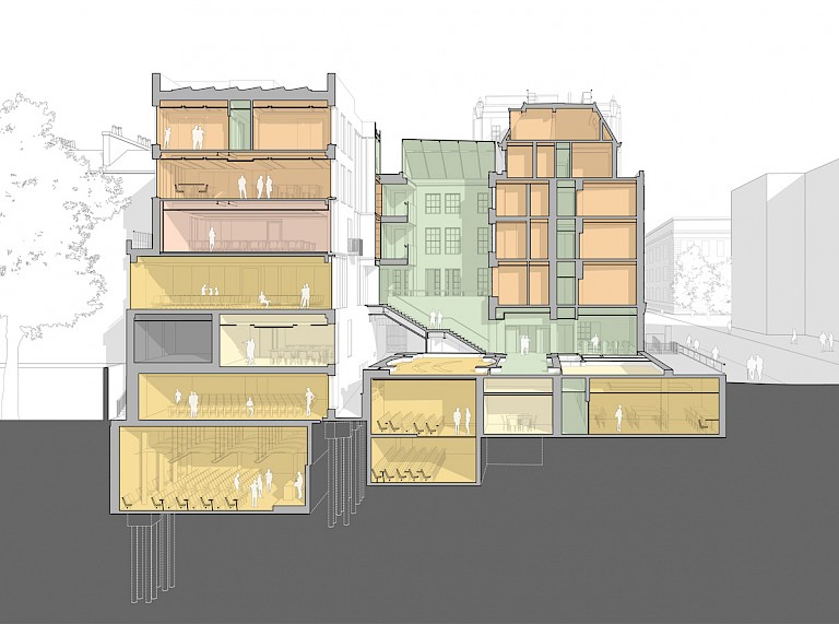 Jonathan kicked off the evening with a presentation on UCL Laws (section below). He first explained the history of the two buildings that make up the Faculty, one of which is Grade II listed, and their lack of cohesion. Our design response joins them together through an atrium to improve access with other measures to rationalise the spaces, behind a newly unified street façade. He then went on to show recent site photos to illustrate how construction is progressing.
