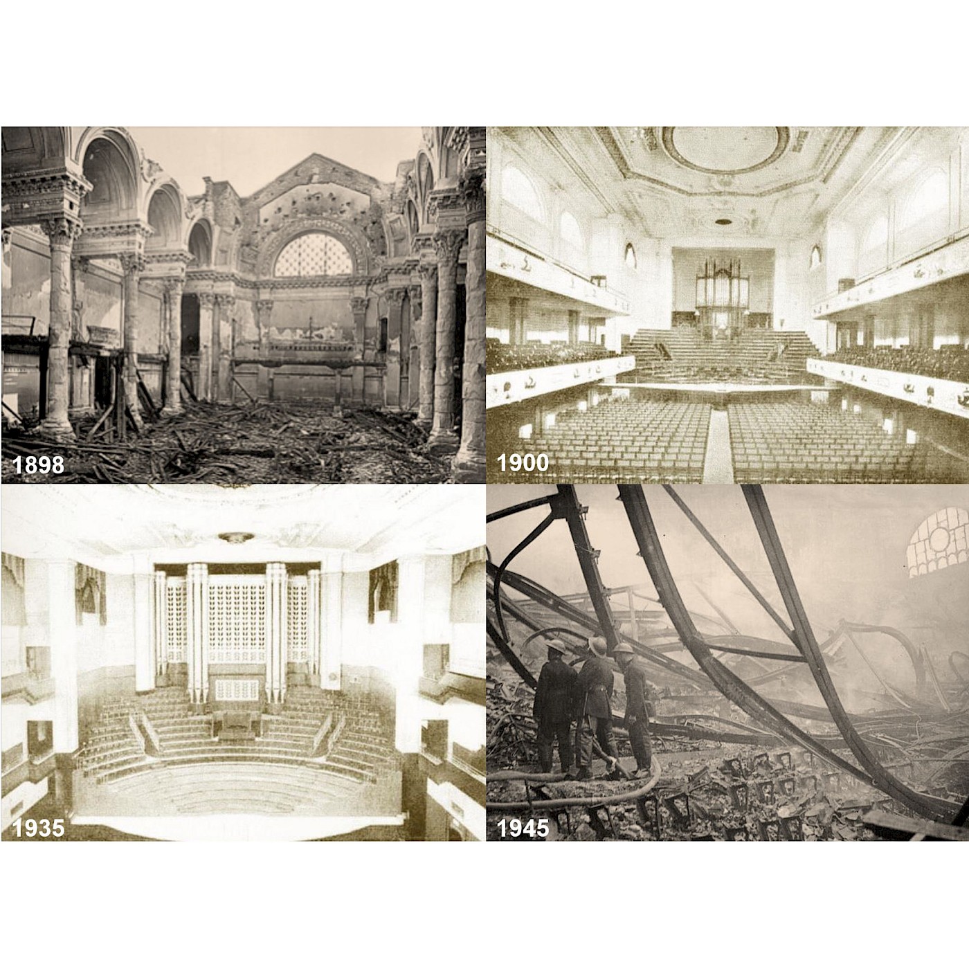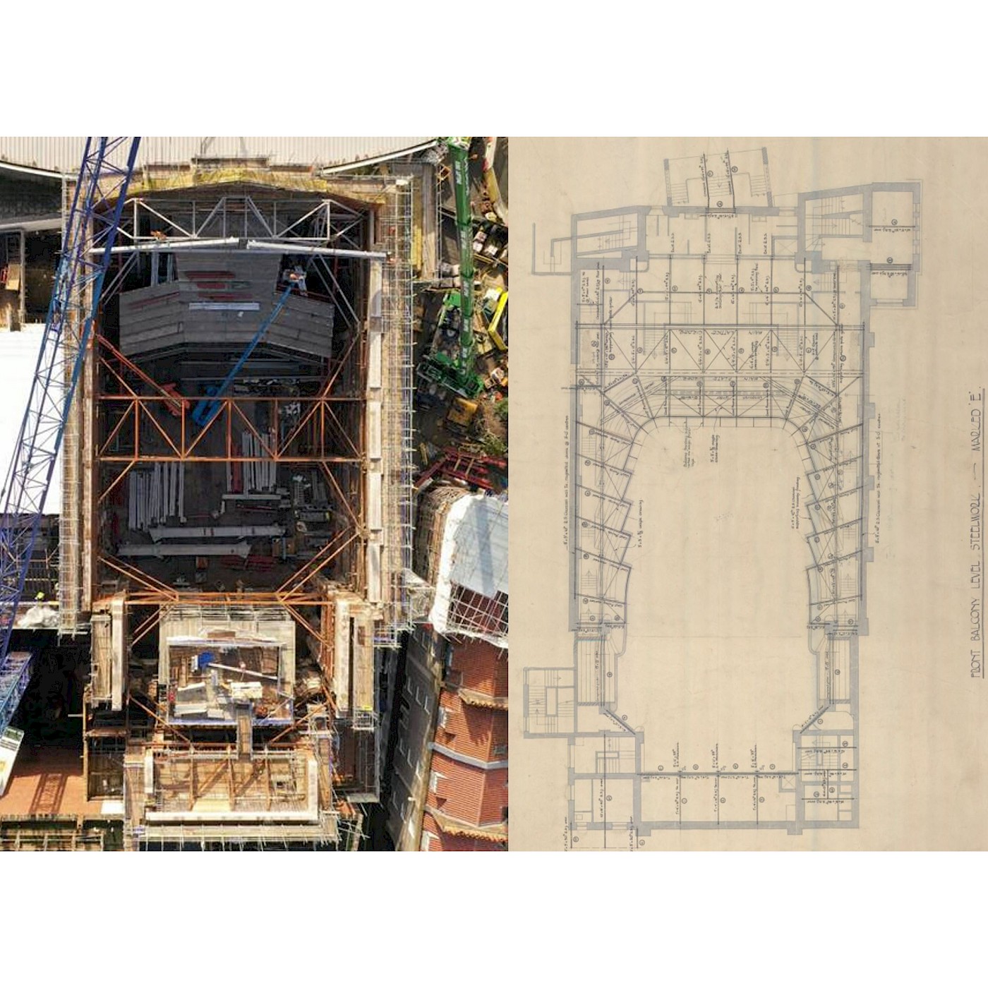 2. The 1950 balcony steelwork drawing is shown beside the drone shot of the main auditorium during reconstruction. Steel was rationed during this era and resources were scarce.