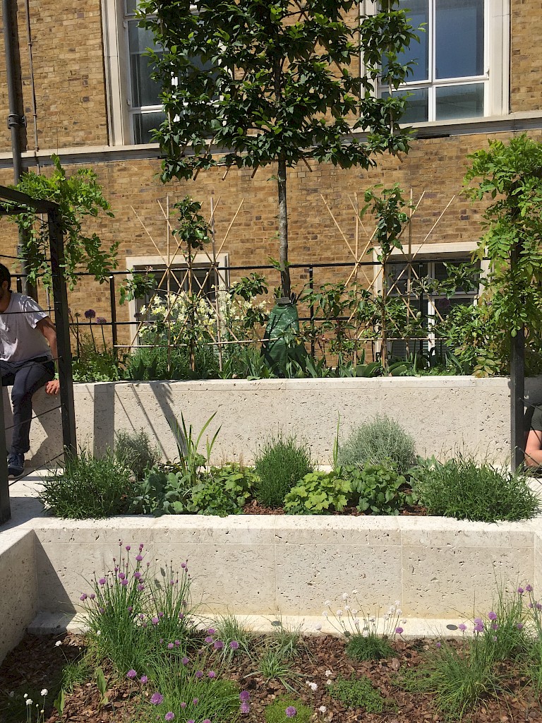 We have a palette of over 50 plants between the main and lower terrace levels, designed for strong biodiversity and wildlife value, incorporating herbs and productive fruiting species. The stonework around the planting is quite well done, too.