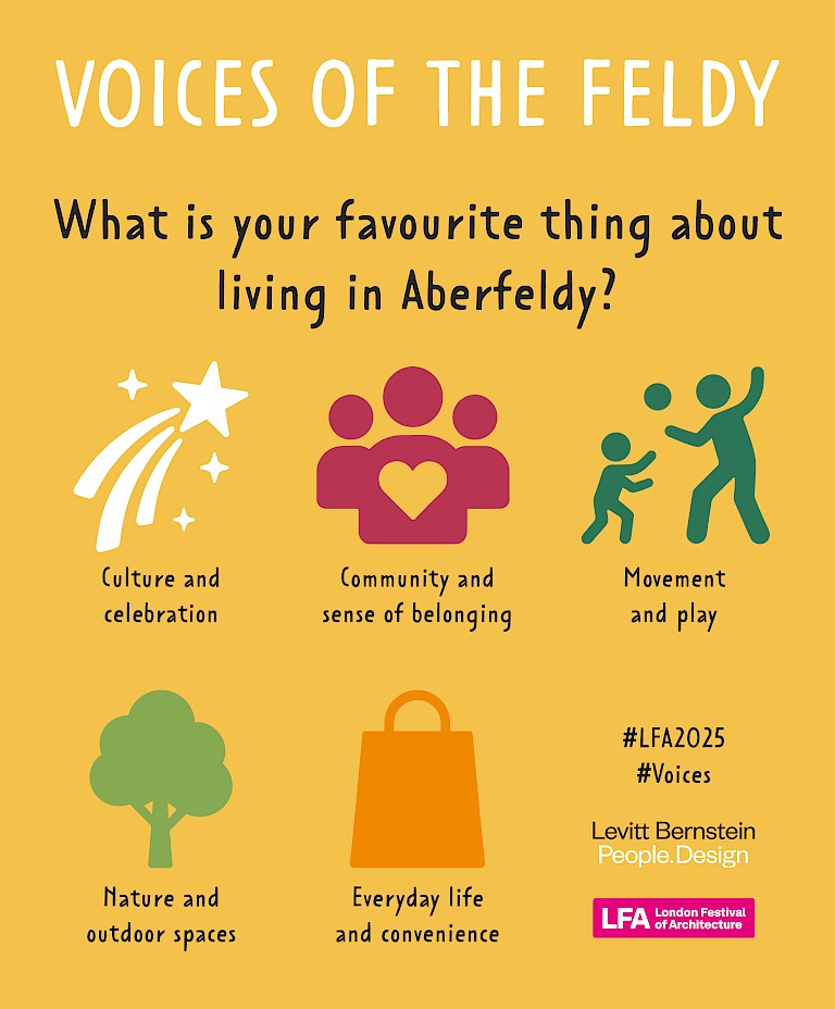 For this year's London Festival of Architecture, we supported the Eid Al-Adha celebrations, for an afternoon of food, joy and togetherness at the ‘Feldy Community Centre. Honouring the voices that shape Poplar, whose traditions and stories are central to the life of this area, we asked local people: “What is your favourite thing about living in Aberfeldy?”