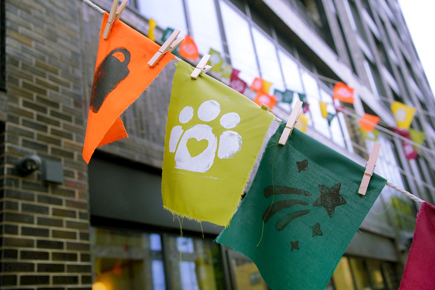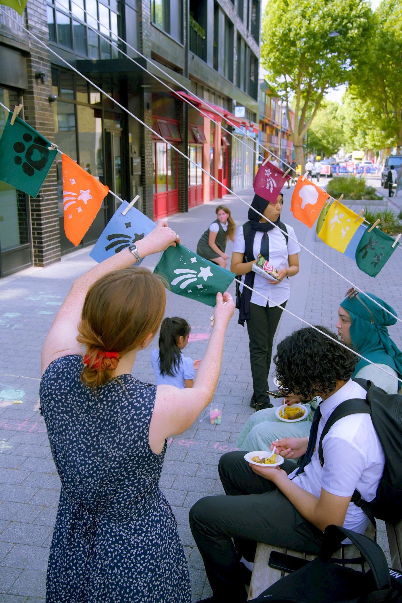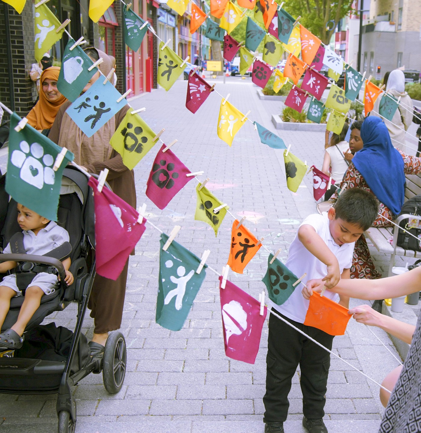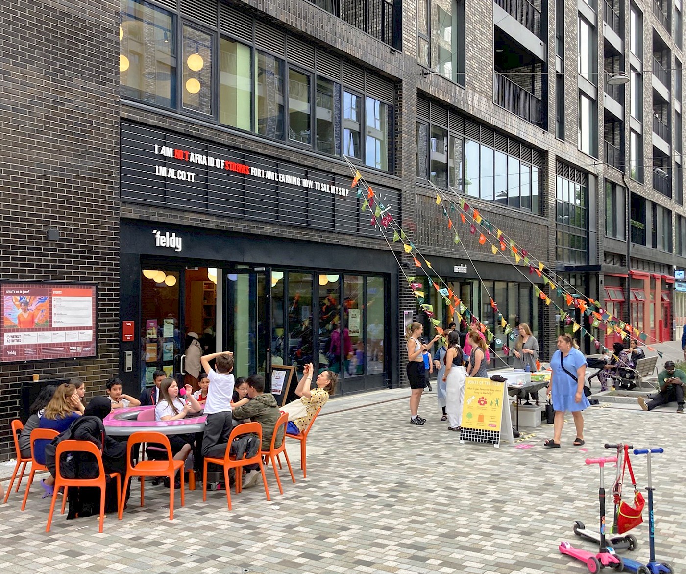 We recorded their responses in the form of printed flags, which came together to create an installation outside the ‘Feldy Centre. The personal reflections hung like bunting across the façade, forming a vivid, visual chorus of community voices. Children were also invited to do chalk drawings in the square, transforming it into a canvas and play space.