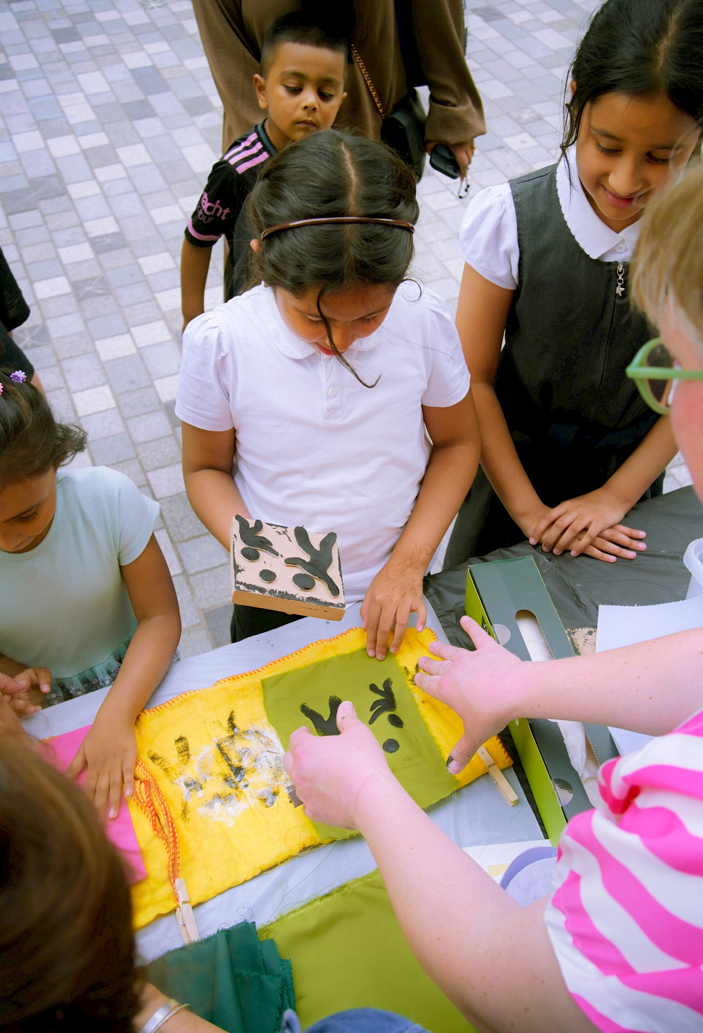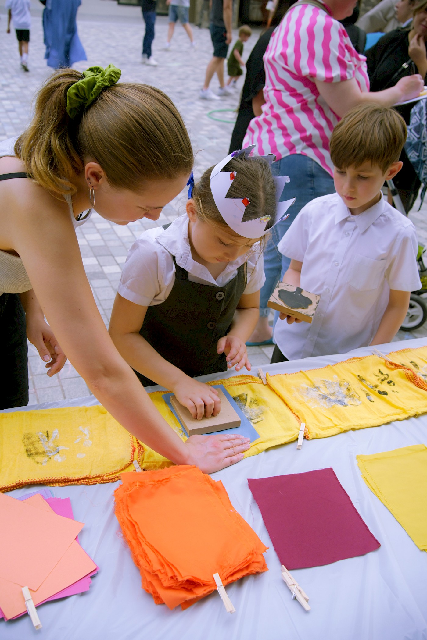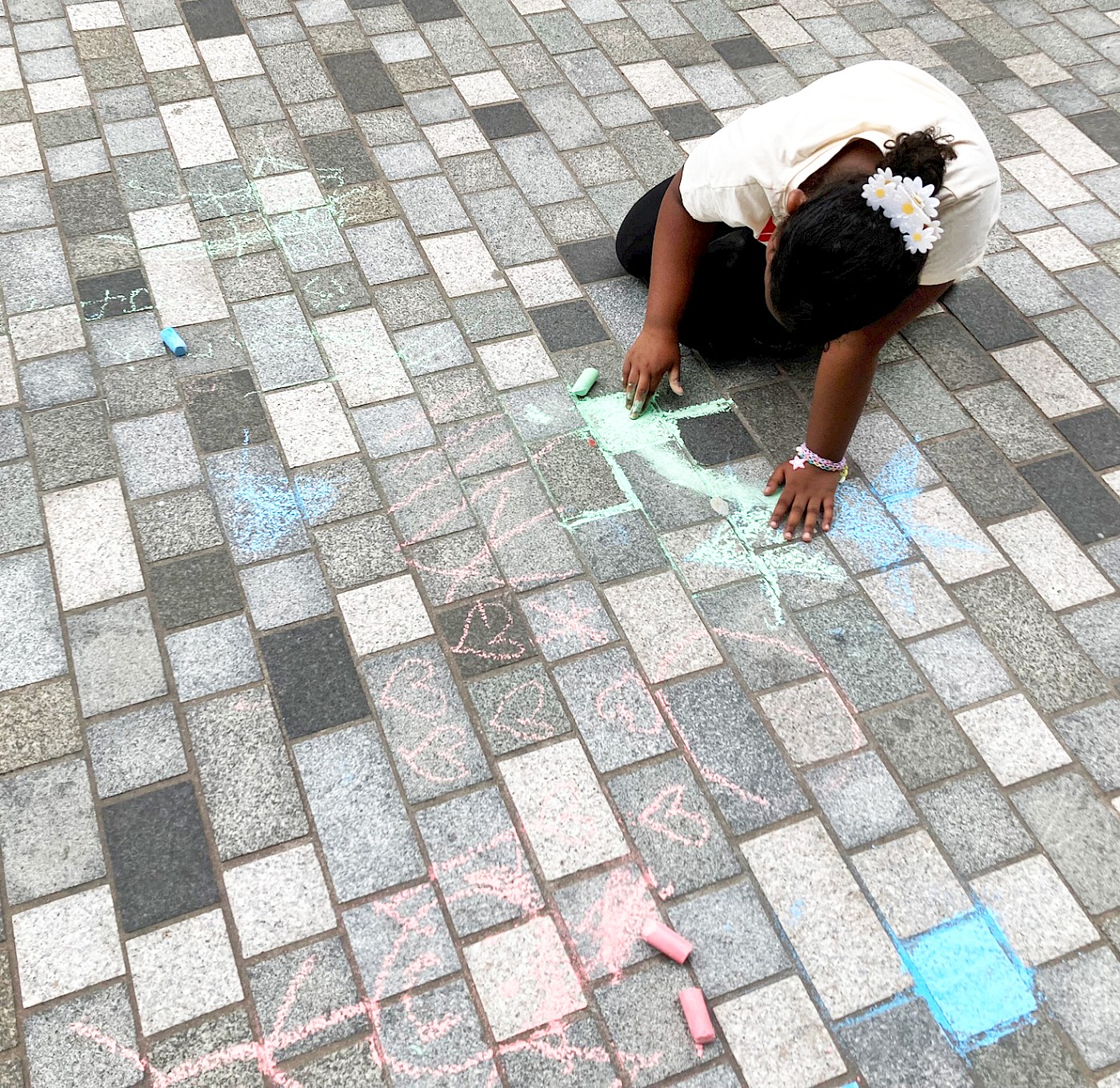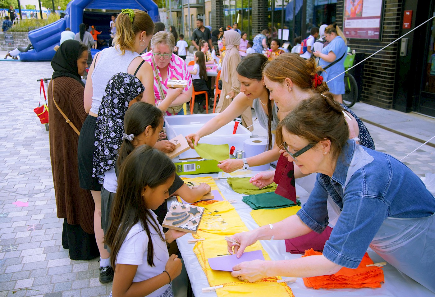 We recorded their responses in the form of printed flags, which came together to create an installation outside the ‘Feldy Centre. The personal reflections hung like bunting across the façade, forming a vivid, visual chorus of community voices. Children were also invited to do chalk drawings in the square, transforming it into a canvas and play space.