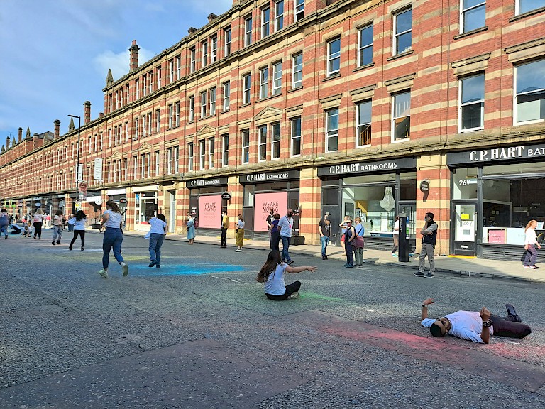 It was performed by a mix of professional dancers and local residents all forming a dancing chain along the 400m-long Deansgate stage (pictured below), one of the main streets of Manchester city centre.
