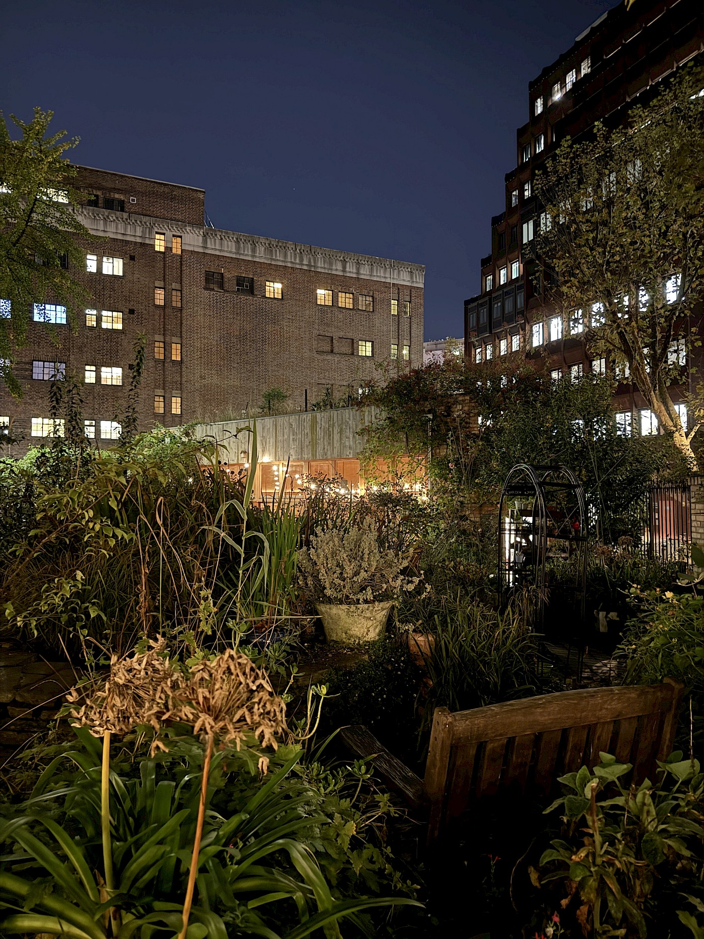 Silence fell upon us as we stepped inside, and we were immediately greeted by a warmly lit, intimate space. Surrounded by a carefully detailed brick and plywood interior, the glazed northern elevation framed a view into the lush garden beyond. As dusk settled, the outdoor lights magically illuminated the garden, while the glazed wall and continuous brick flooring seamlessly blurred the boundary between inside and outside. It felt as if we had stumbled into a hidden oasis, worlds away from the noisy Soho just on the other side of the wall.