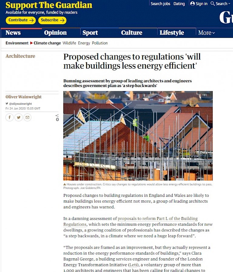 The Guardian interviewed me and Clara Bagenal George from Elementa, on behalf of the London Energy Transformation Initiative (LETI), about the proposed changes to Part L of the Building Regulations. We explained why this would likely result in a step backwards, in a climate where we need a huge leap forward. We are calling for a strong consultation response by the industry on Part L, with a dramatic shift needed – or else we will not meet our climate change targets.