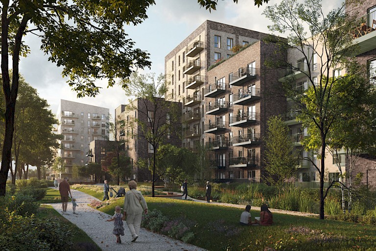 The architecture will define distinctive character areas within the new neighbourhood, with the scale varying from two storey houses to nine storey marker buildings, responding to the surrounding context. In total, 753 new tenure-blind homes will be provided, varying from apartments, maisonettes and houses. 272 of these homes will be affordable, reproviding the existing estate homes to meet the residents’ current needs. The residents were a key part of the design process, right from earliest masterplan ideas through to selection of materials and internal layouts of homes.