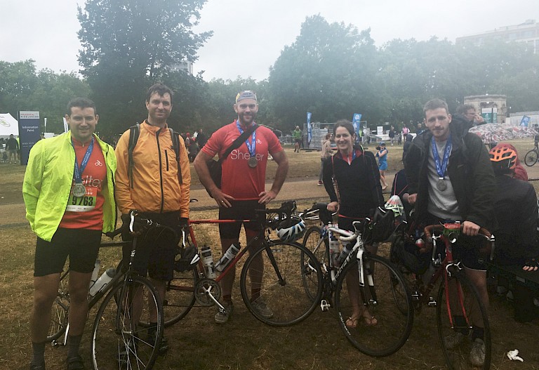 Sunday brought an end to the great British summer heatwave and the beginning of our 100 mile RideLondon cycle through lashing rain and head-winds to raise money for Shelter. Our hardy group of nine started as early as 6.08am, setting off from the Olympic Park, through the closed roads in central London, heading towards Richmond Park. The hundreds of riders then worked their way south, taking in the Newlands Corner, Leith Hill and Box Hill climbs, Leith Hill being the steepest. The general consensus was that the team hit ‘the wall’ around mile 80, however, with the aid of numerous protein bars and cheers of encouragement from rain-soaked supporters lining the route, it was largely all downhill coming back into London, where we finished with a sprint on the Mall. A great effort by everyone to get round, considering the awful conditions. A big thank you to everyone who donated to our team. I would say that, due to the conditions, you got your money’s worth.