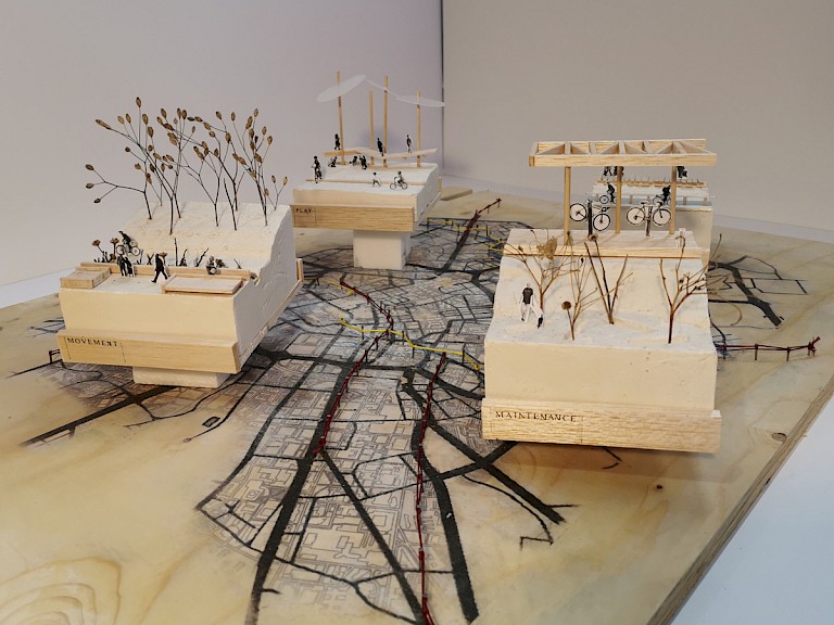 By studying Manchester’s potential to become car-less, we were also aware that the city needs to shift to accommodate different modes of sustainable transport. Through understanding the climate and geography of Manchester, we designed and cast four plaster proposals to sit on top of a map that is an ink and glue transfer onto plywood. On the casts, balsa wood is used to represent new public street furniture and infrastructure that encourages four elements linked to interactions with the city, as a cyclist and pedestrian. They are: movement, maintenance, play and the retention/use of water.