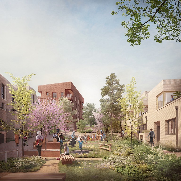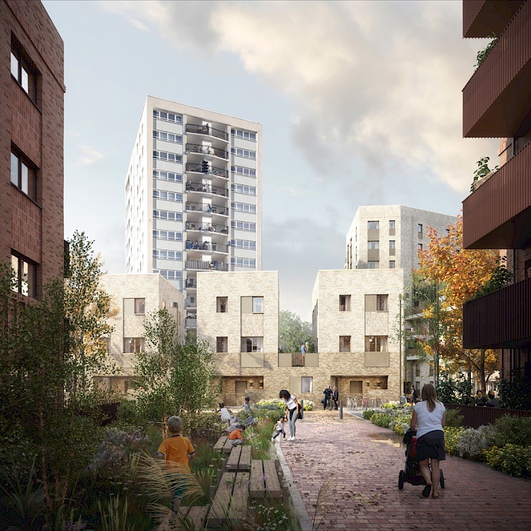 The new buildings are easily accessible for all from nearby roads and public transport through the use of new dropped kerbs and tactile paving, and are arranged around a new low speed internal street which runs through the site and provides accessible level routes to a series of play areas and a new community building.