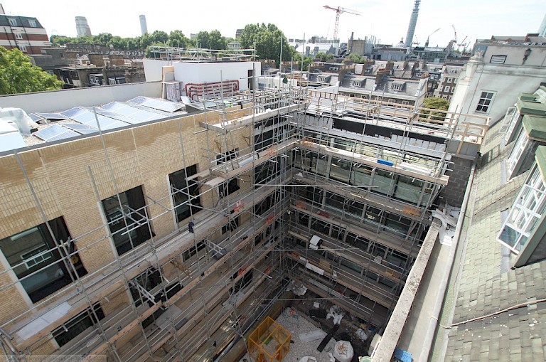 We stopped by UCL Laws this morning following the removal of scaffolding on Endsleigh Street (above), whilst the scaffolding to the rear courtyard is in the process of being struck (below). Our design integrates Bentham House – a Grade II listed former Union Headquarters – and the adjacent mid-20th century Gideon Schreier Wing to provide teaching/seminar spaces, a hub and improve accessibility into and around the building. Next step: taking care of those holes in the roof!