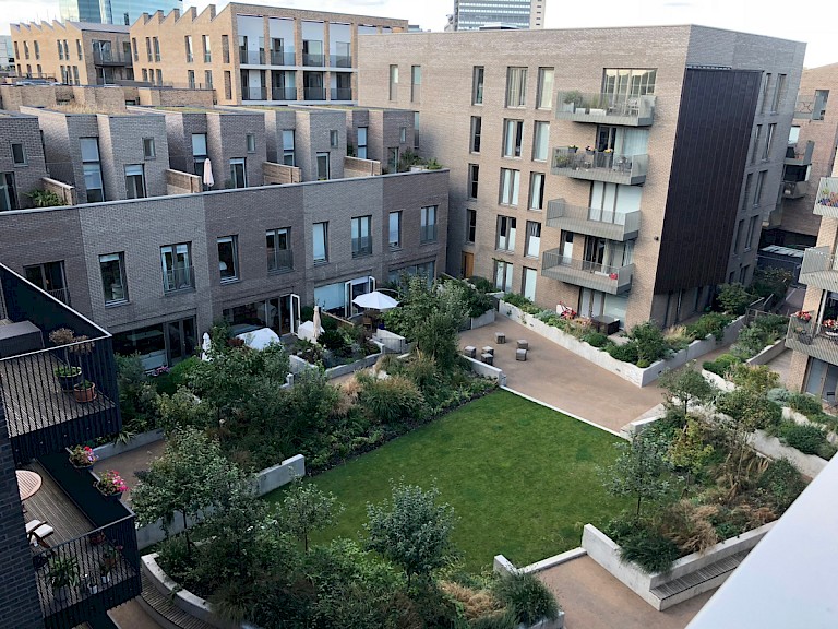 Phase 1 (pictured above), by Morris+Company, Mikhail Riches and Karakusevic Carson Architects, is very well established. We were lucky enough to get access into the courtyard (pictured below), designed by landscape architects Camlins. Private back gardens, whilst overlooking the central shared amenity space, did not feel significantly exposed thanks to the planting strategy. It was nice to see that these gardens were well-used. Another nice surprise was the visit up to the community garden/allotment space on the roof, which is a highly successful resident-led initiative.