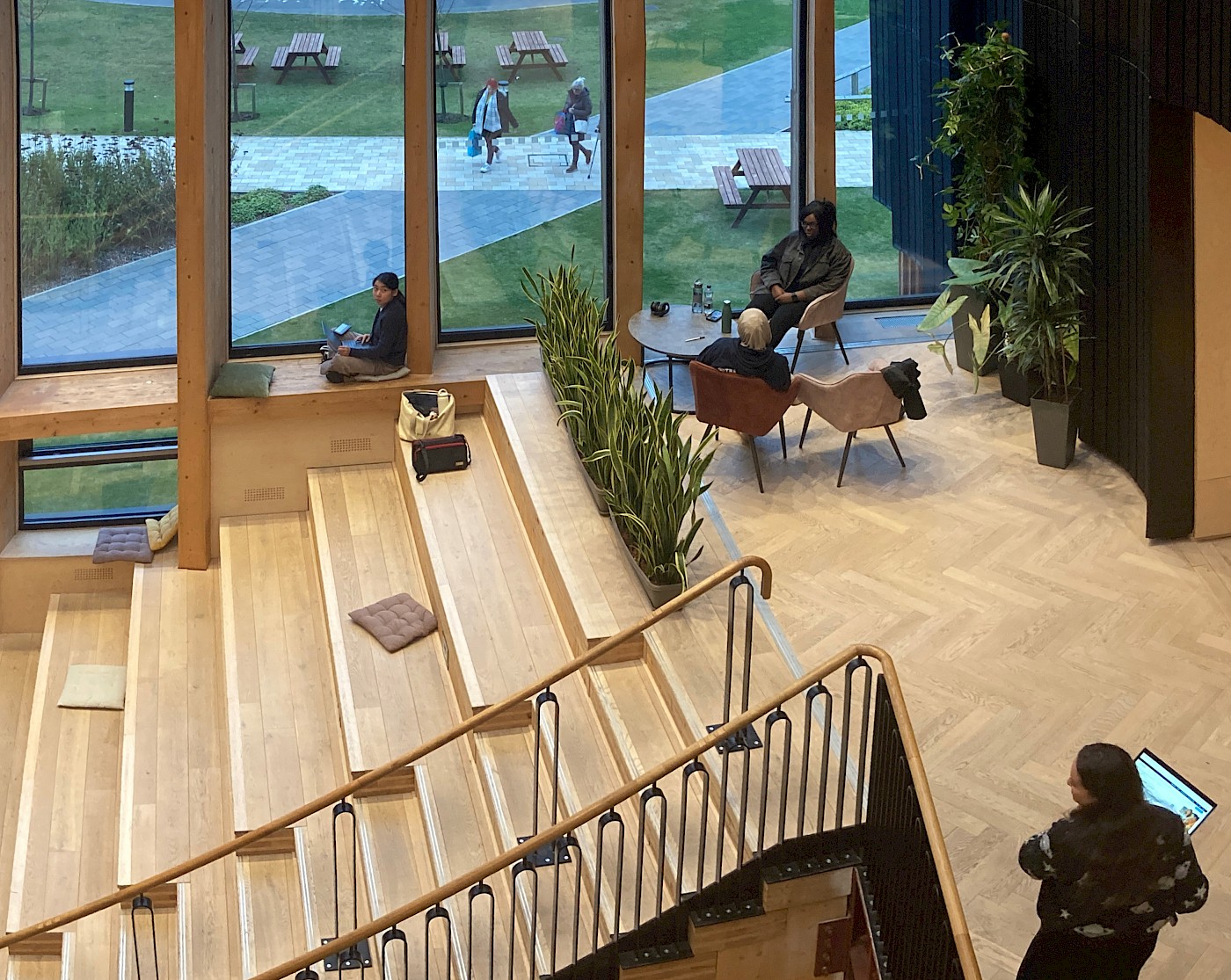 These are splayed from a generous central entrance atrium, that ascends the height of the building. The first flight of stairs incorporates amphitheatre style seating and offers niches to inhabit within the curtain walling. An interesting lesson learnt here being that students only started utilising these offerings after the nudge of cushions were offered, firstly assuming the steep steps to be sculptural stairs rather than places to rest. An architectural quirk to consider for any designer moving forward as to how to give building users the excuse to take them up on their design. Luckily, when I visited, the students were well and truly in the practise of studying and gathering in these set down seats.