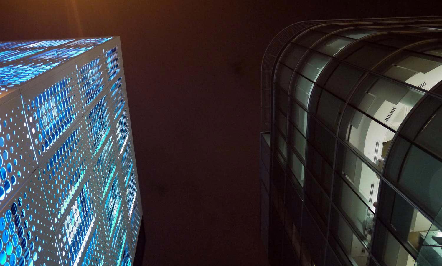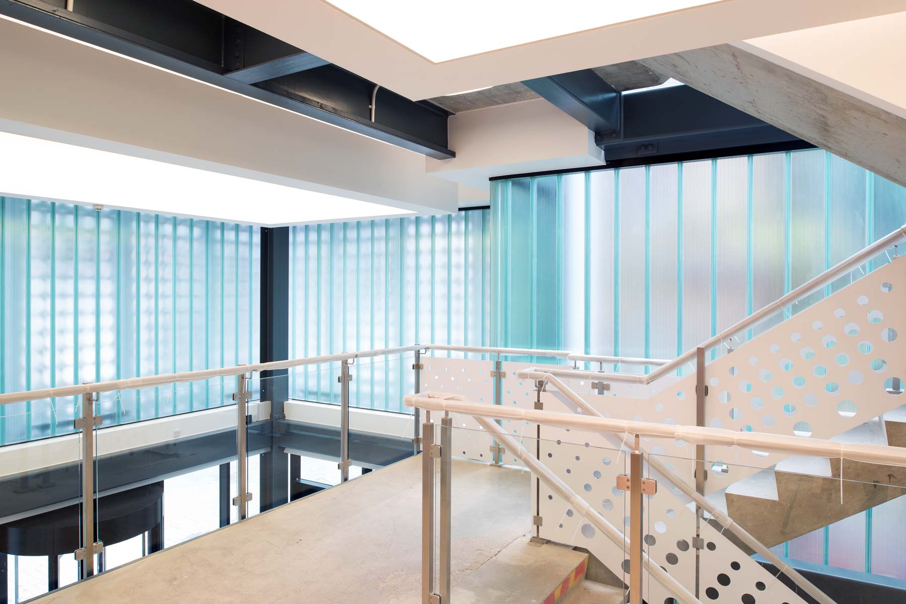 Being flanked on all sides by glass office blocks, we wanted to take a different design approach. We developed a very simple, cost-effective frame with a more elaborate skin sitting over the top. Wrapping around the building, this powder-coated aluminium screen has laser cut circular openings, revealing a contrast with the simple black panels sitting behind it. Illuminations are also projected onto the screen, creating more interest at street level. Inside, the exposed steel structure, services and concrete soffits create a raw, industrial aesthetic.