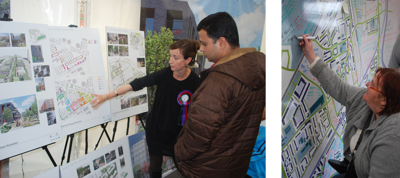 Director Jo McCafferty discusses design proposals with community members, both images ©Poplar HARCA