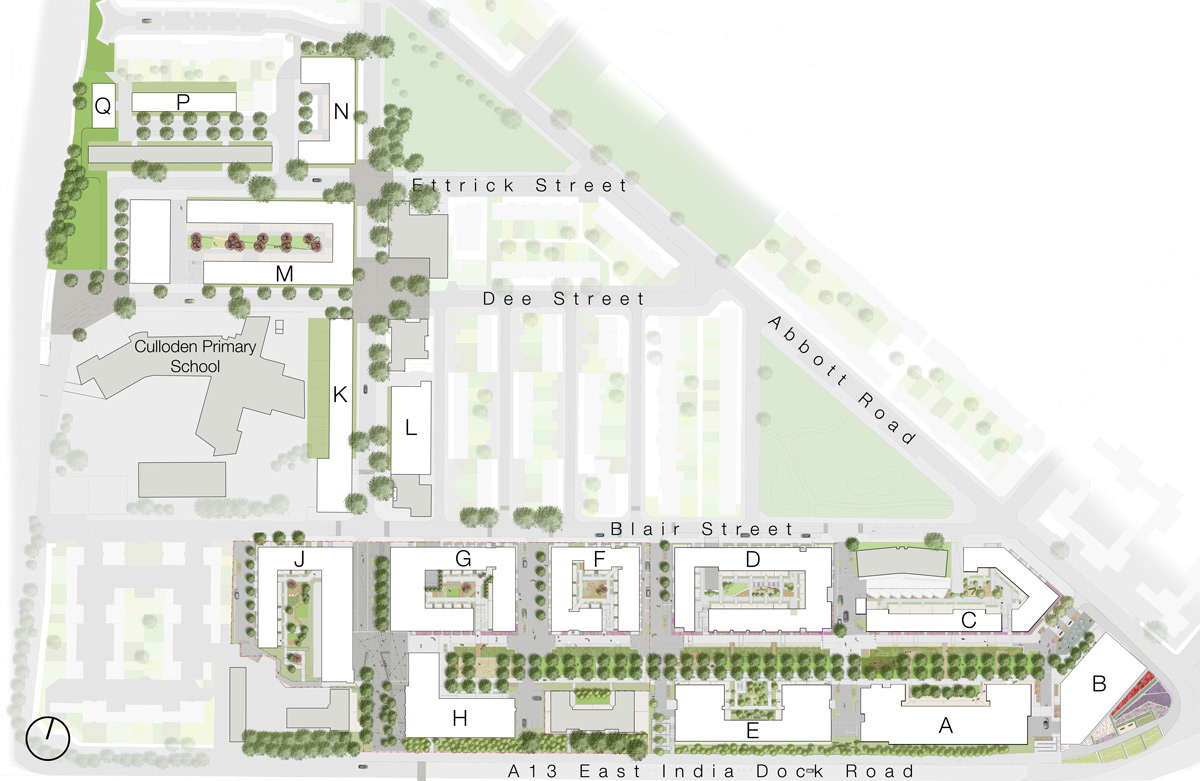 Owned and managed by Poplar HARCA, the estate was situated on a hidden pocket of land – bounded by the A12, A13 and River Lea. Gasholders to the north east and Erno Goldfinger’s iconic Balfron Tower to the west completed the urban context. Initially a very self-contained site was opened up by a new pedestrian crossing over the A13, connecting the community to the south and East India DLR station.
