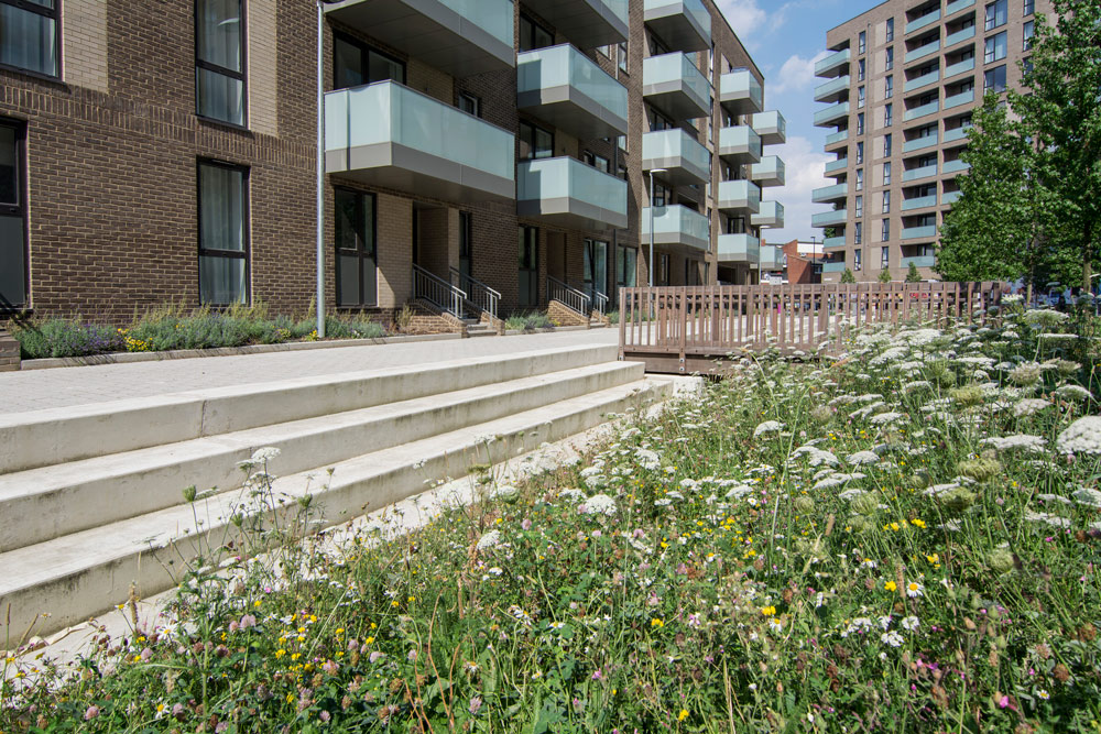 A new linear park sits at the heart of the neighbourhood, with open lawns and varied play spaces, lined with trees and seasonal planting to provide colour all year round. The park is also a key part of the sustainable drainage system and biodiversity strategy, which was developed with the London Wildlife Trust to ensure the new landscape fosters a broad range of species. A continual swale runs along the full length of the park with steps facing south, providing informal seating. Plants for pollinators; brick faced boxes for birds; biodiverse roofs and a variety of trees, shrubs and flowering bulbs will create diverse habitat types that previously did not exist.