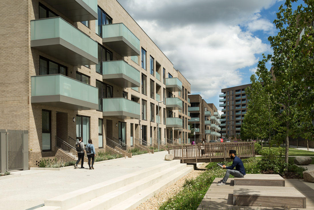 New homes are arranged around this linear green space in medium rise, high density buildings ranging from four to ten storeys. Lower, more domestic scale buildings sit adjacent to the neighbouring estate, whilst higher, muscular, robust buildings along the A13 provide a degree of protection to this urban edge.