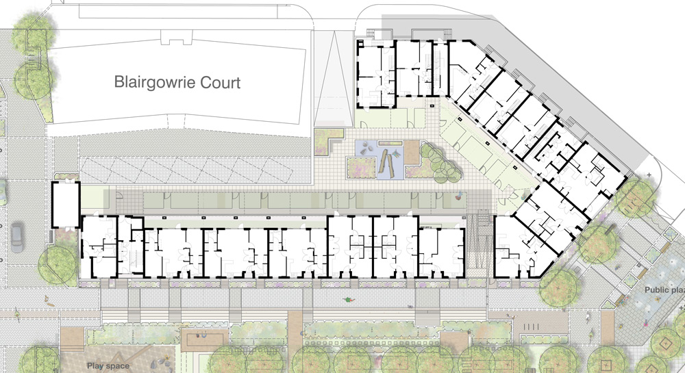 Building C ground plan: raised communal courtyards provide defined areas for residents to gather