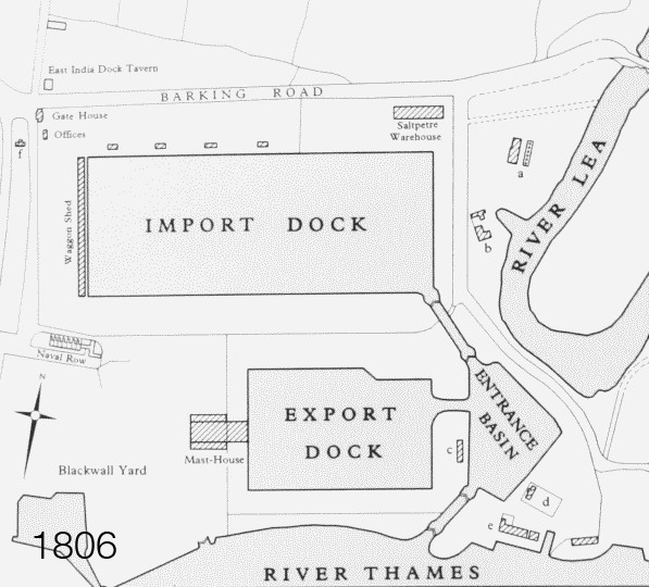 The East India Docks opened in 1806 and were designed by John Rennie and Ralph Walker. This site was nearly obliterated during WWII and since redeveloped. Image published by London County Council