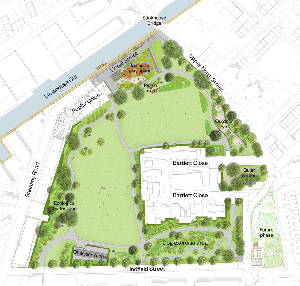 Our work at Bartlett Park in Poplar focused on improving the leisure and ecological offer provided by this area and connecting it to the adjacent asset of the Limehouse Cut canal. It was vital that the new park would accommodate the needs of the wider community.