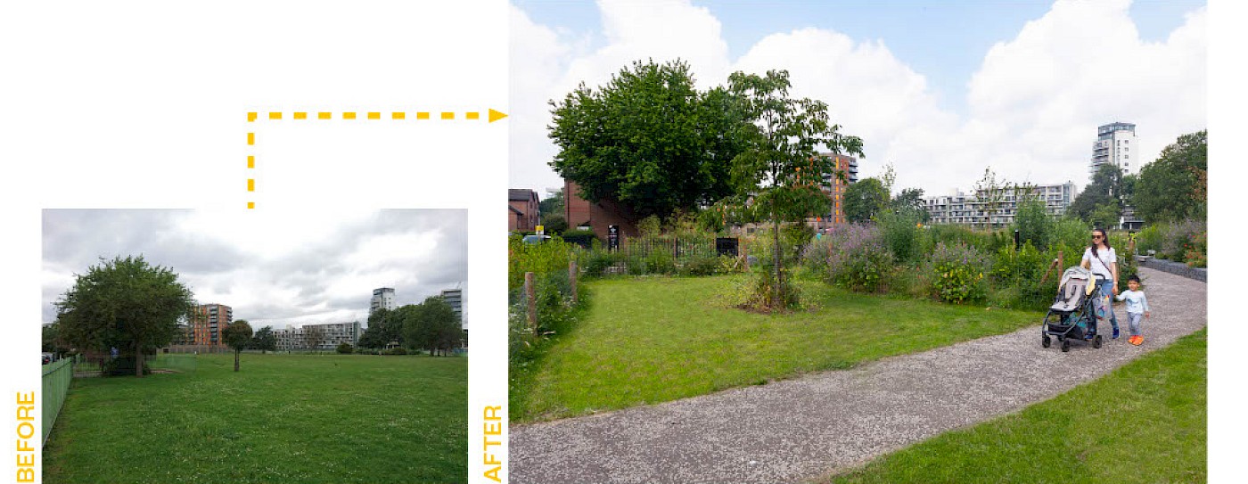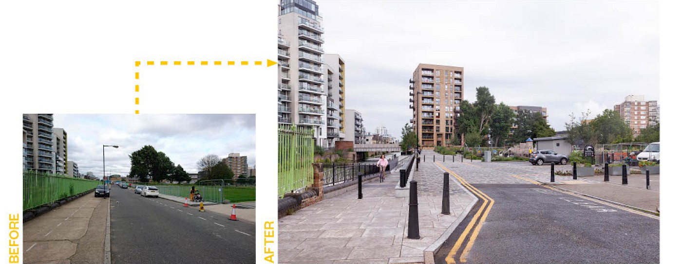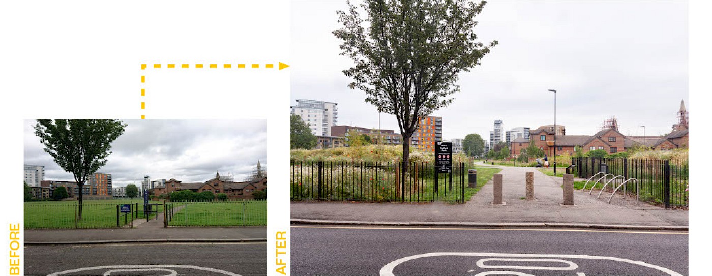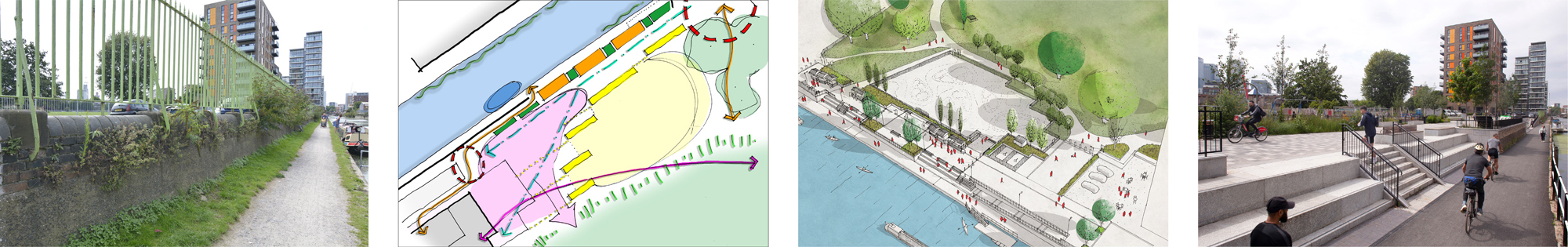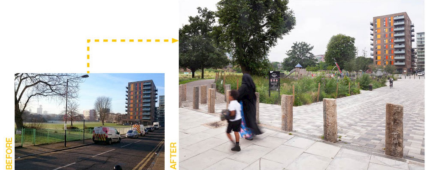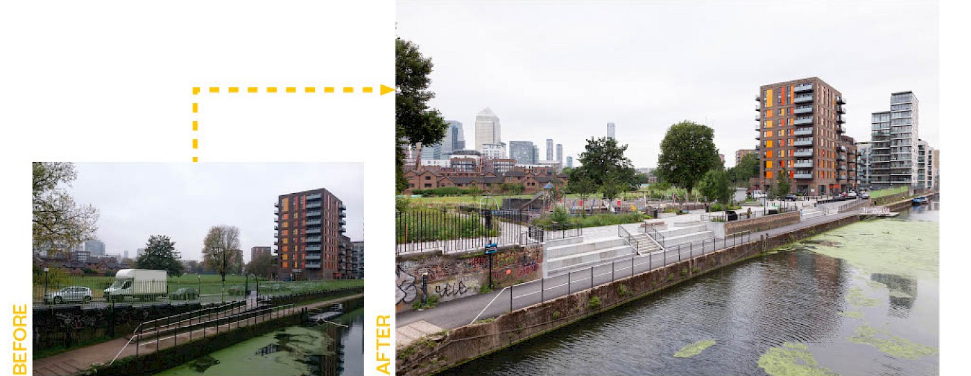 The Limehouse Cut canal is a major asset to the local area but was underutilised. Before works began, the canal was disconnected from the park by Cotall Street, existing high railings and 2m height differences between the canal towpath and road/park. Users of the canal or the park were often not aware of one another.