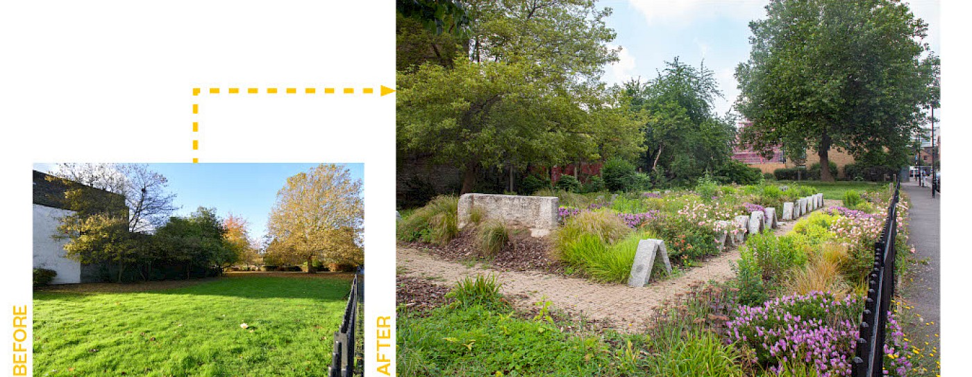 To enhance the feel of separation from the surrounding area, we used gabion structures with tree, shrub and wildflower planting