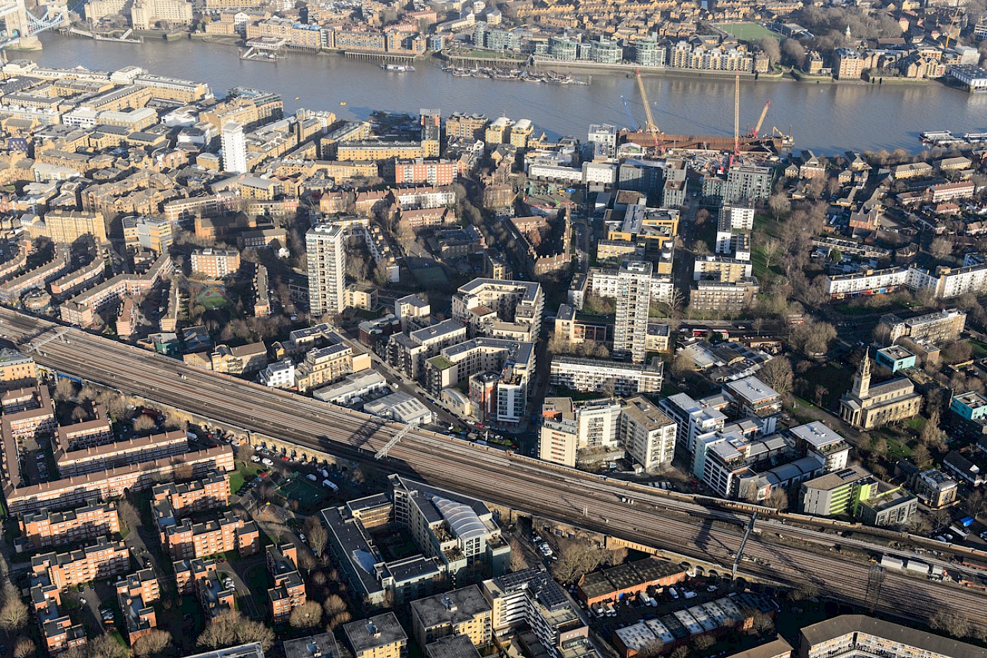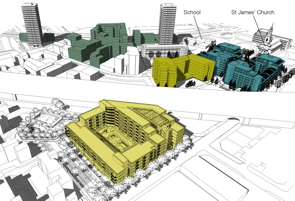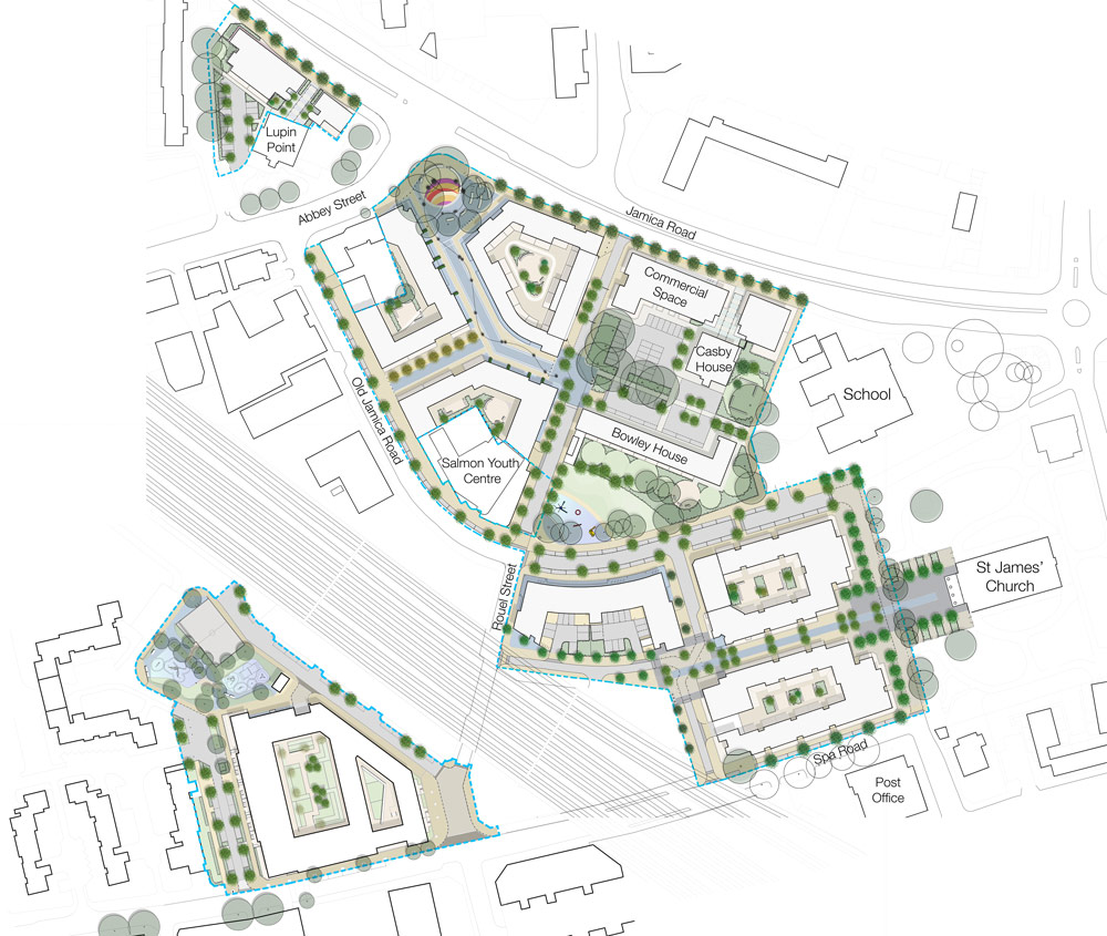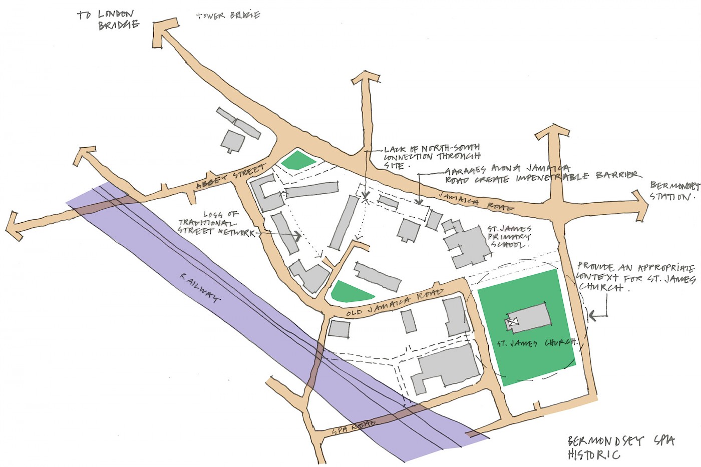 Bounded by railway lines on one side and the busy Jamaica Road on the other, the site was home to run down council buildings and disused car parks. A bomb site left over from the Blitz had become an adventure playground for local children. The one building of value that remained was the Grade II* listed St James’ Church, a local landmark that had remarkably survived the war unscathed.