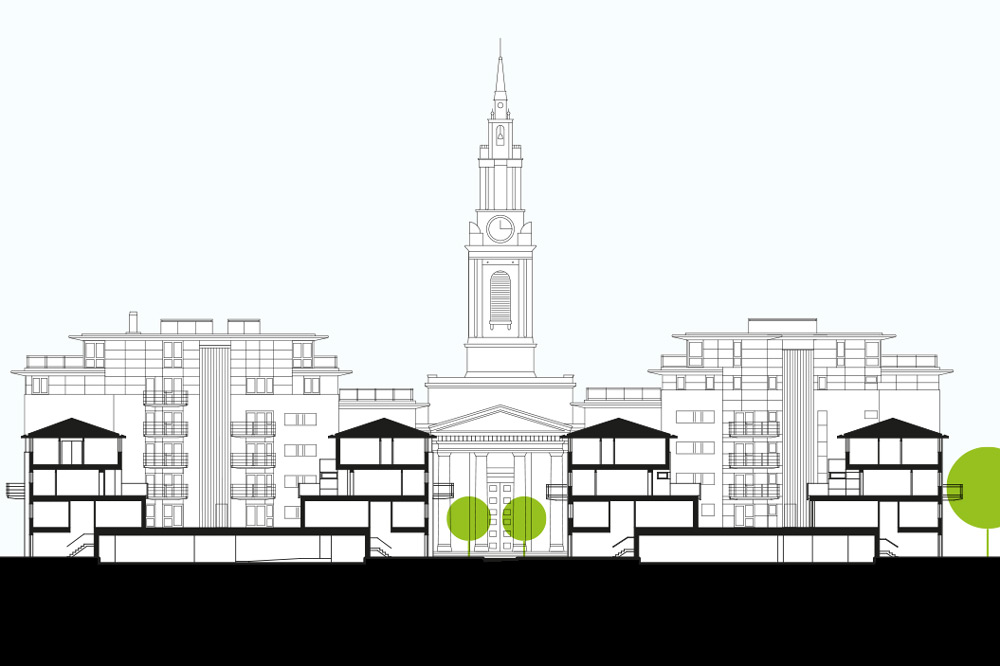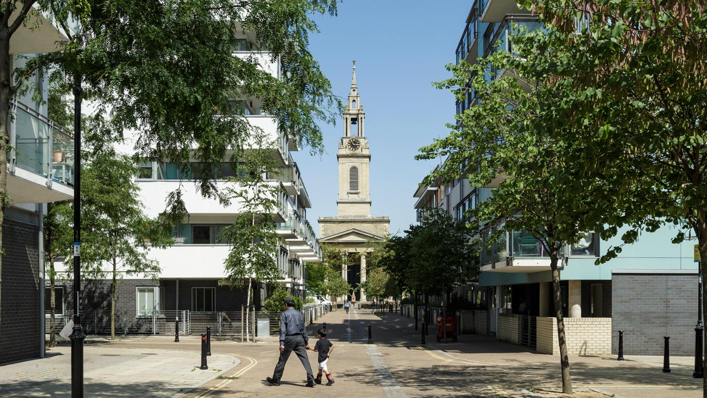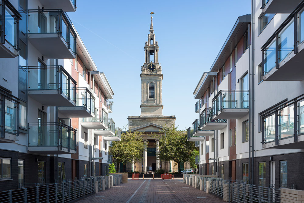 In order to meet the GLA's targets and those of the original masterplan, but still create a high quality streetscape for the community, the new buildings are between three and ten storeys, with the taller elements strategically located near Jamaica Road and the railway lines. Buildings near the church are much lower, sitting below its ridge height to protect views of the spire from the wider area. These also have a more horizontal emphasis to sit comfortably with the verticality of the church spire.