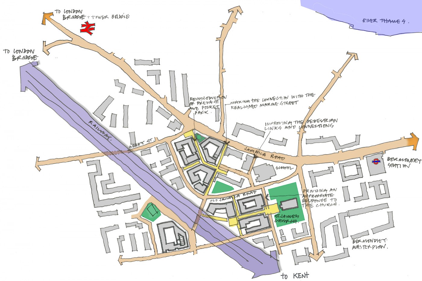 The starting point for our masterplan was to identify the key destinations surrounding the site: Tower Bridge and the Thames to the north, and St James’ Church and Bermondsey Underground station to the east. We then looked at ways we could create connections between the site and each of these places.