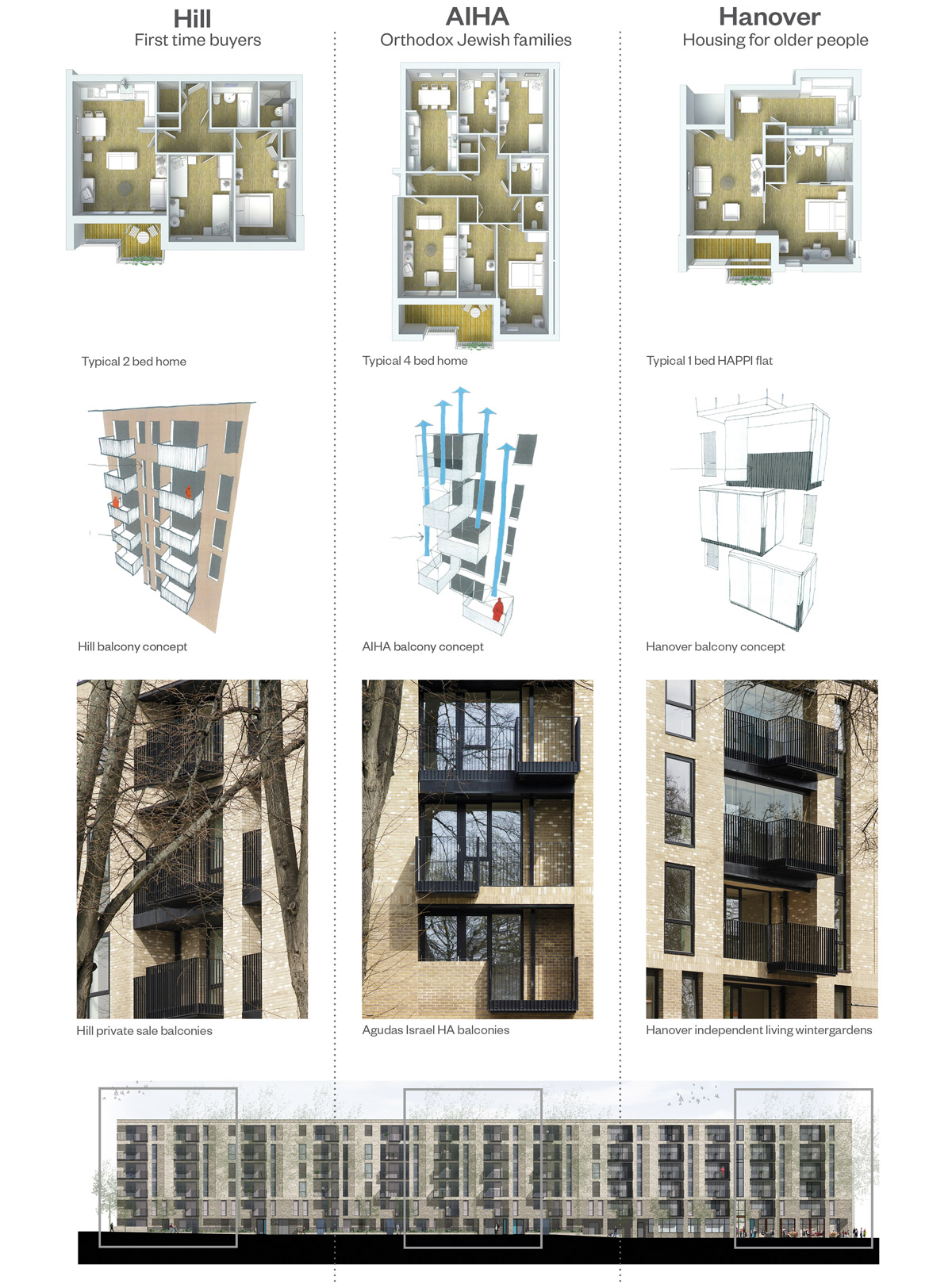 This unusual project involved working with three separate clients, each with a distinct brief, to provide new homes for three different communities: first time buyers, Orthodox Jewish families and older people who need extra care. Our challenge was provide of each group of residents with homes meeting their needs within a single, elegant building.
