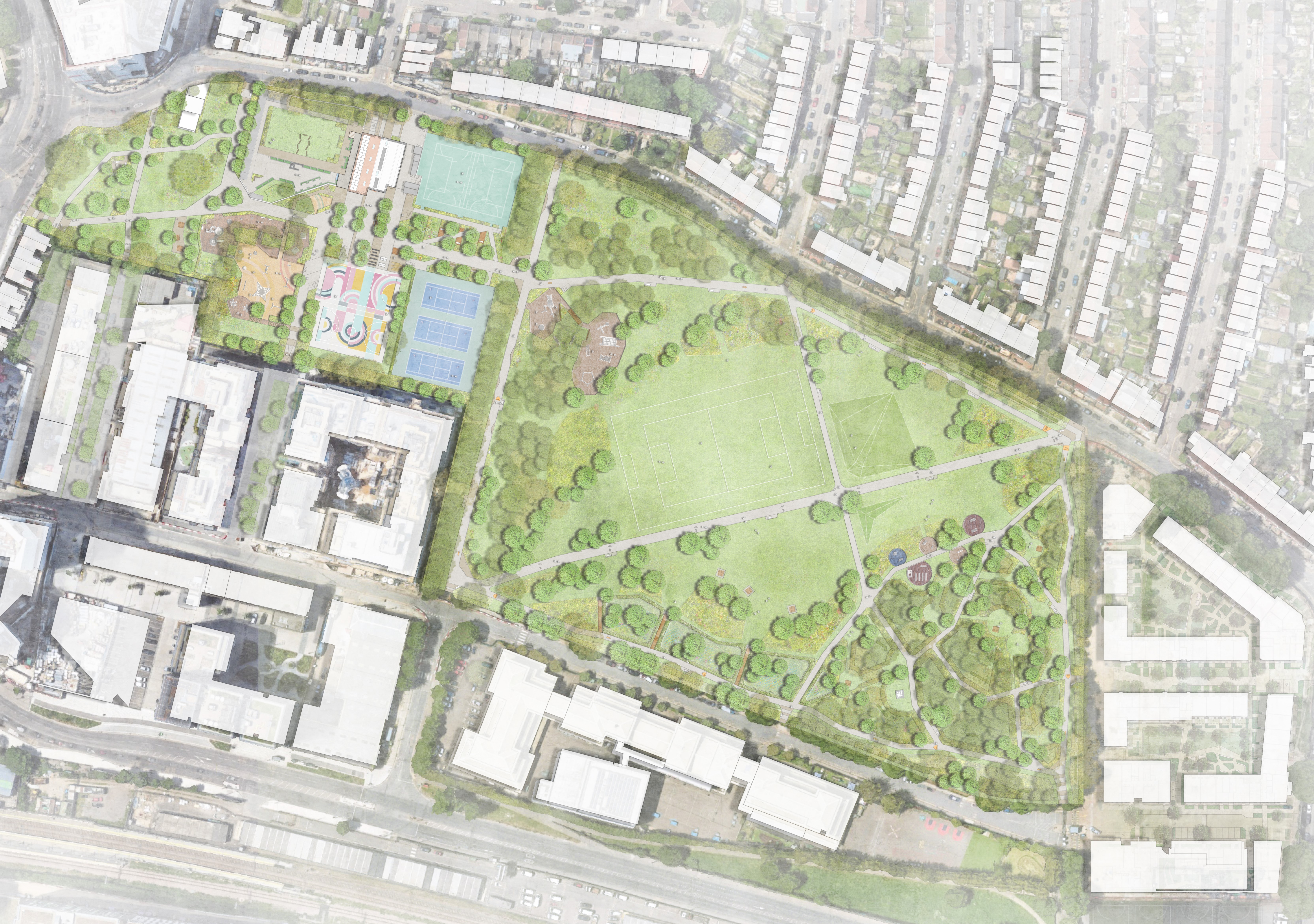The masterplan strengthens east-west connections from Tottenham High Road to the Lea Valley via the Chestnut Road linear park and the Paddock greenspaces.