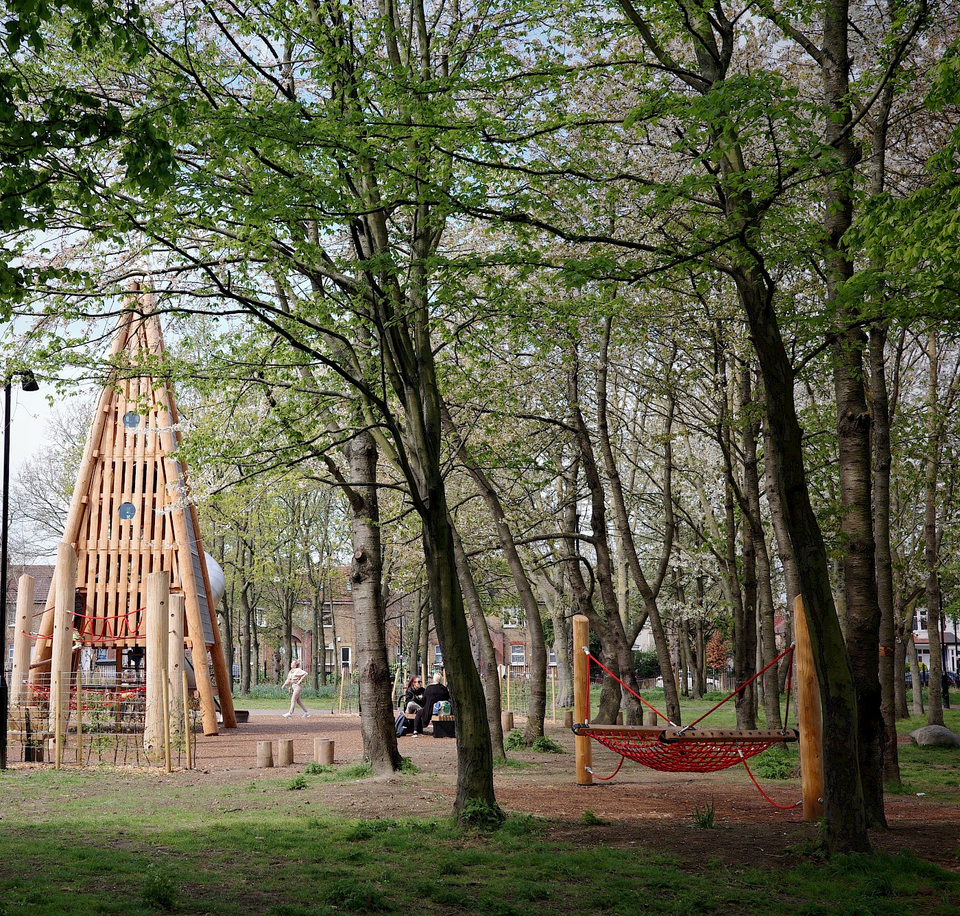 Completed playspace is set within existing trees, providing landmark play destination along key movement routes.