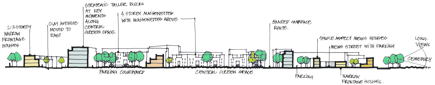 We have devised a masterplan with five distinct character areas. A formal entrance green and series of new lanes lead into the neighbourhood off Acacia Road and Mulholland Close. The Lanes are like mews streets, intimate in scale and character. Building heights increase nearer the central linear park, up to a maximum of nine storeys. Larger scale, more robust buildings front onto the central green space and form a distinctive skyline. Towards the south of the masterplan, a series of housing courts and traditional mews streets feature a variety of house types and overlook the adjacent cemetery.