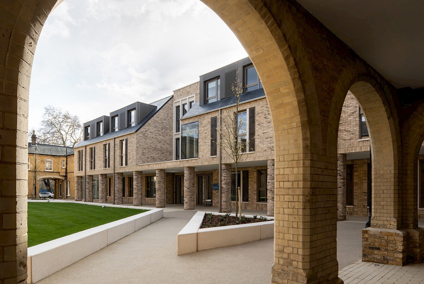 The different elevational treatments respond to their respective contexts: facing the quad features a lower roof eaves line and single storey colonnade to tie in with that adjacent, but with lozenge shaped columns. In contrast, the elevation facing the playing fields is more imposing, with the full three storeys expressed vertically using carefully proportioned brick, stone and window detailing.