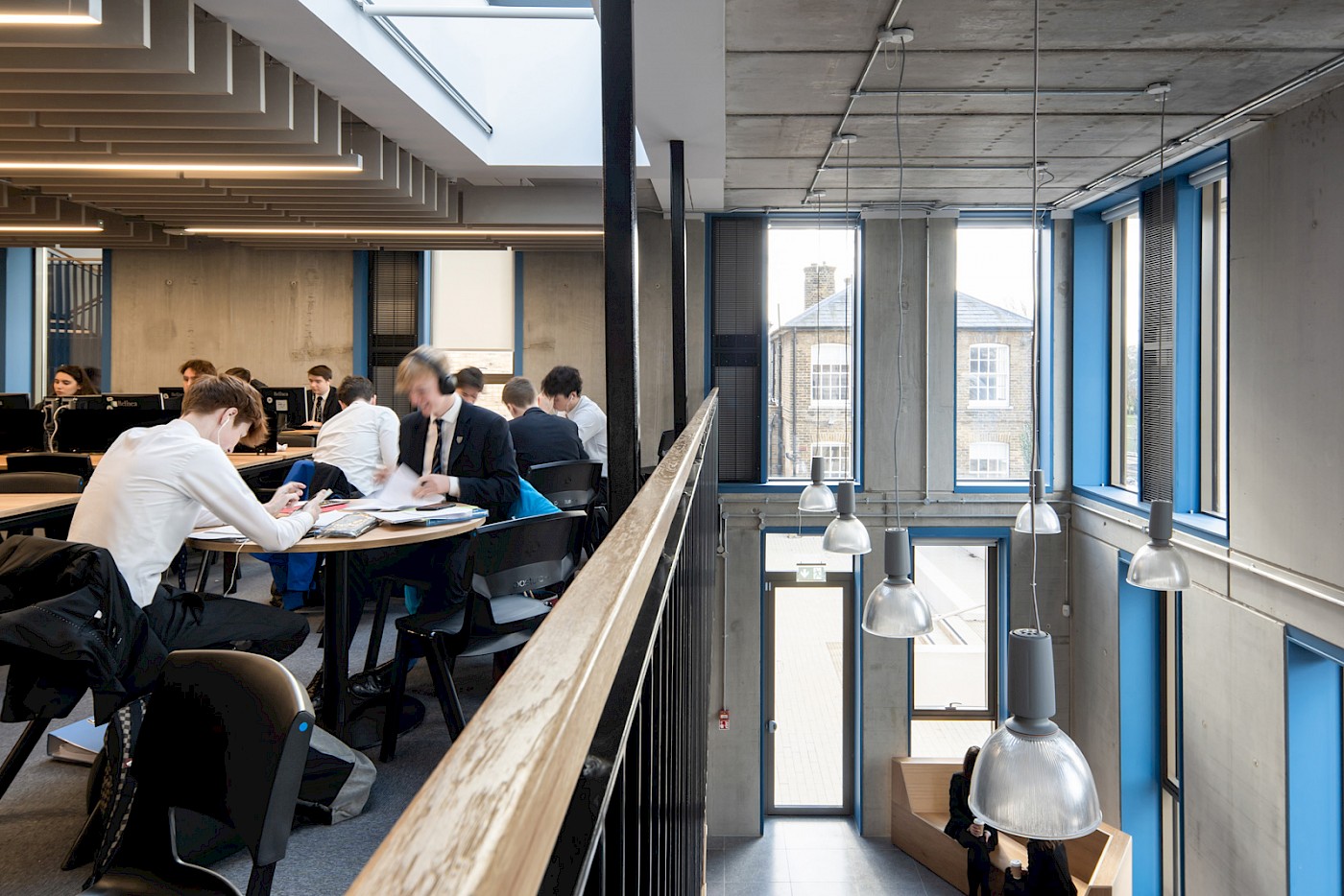 A triple height, central glazed atrium creates a stunning entrance and focal point for the whole school, whilst providing a visual and physical link between the quad and playing fields. The sixth form centre sits directly adjacent to this, visible to all students.