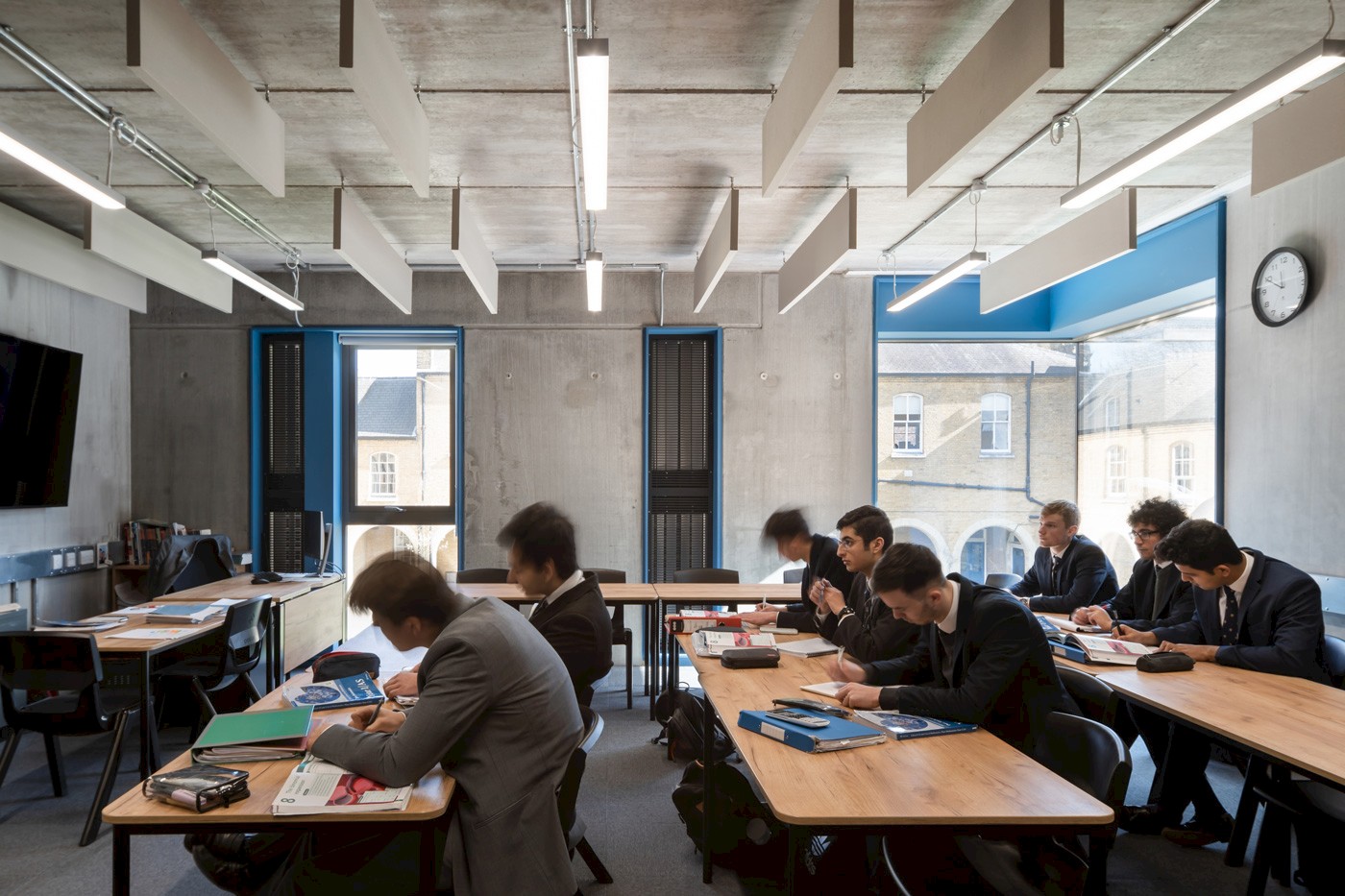 Located adjacent to the listed main school building and forming the fourth side of the historic quad, the design of the new sixth form, maths and languages building is a modern interpretation of classical architecture. New brick façades and precast stone features complement those of the surrounding buildings, whilst the precast concrete structure is exposed internally to create a contrasting contemporary finish to the more traditional details.