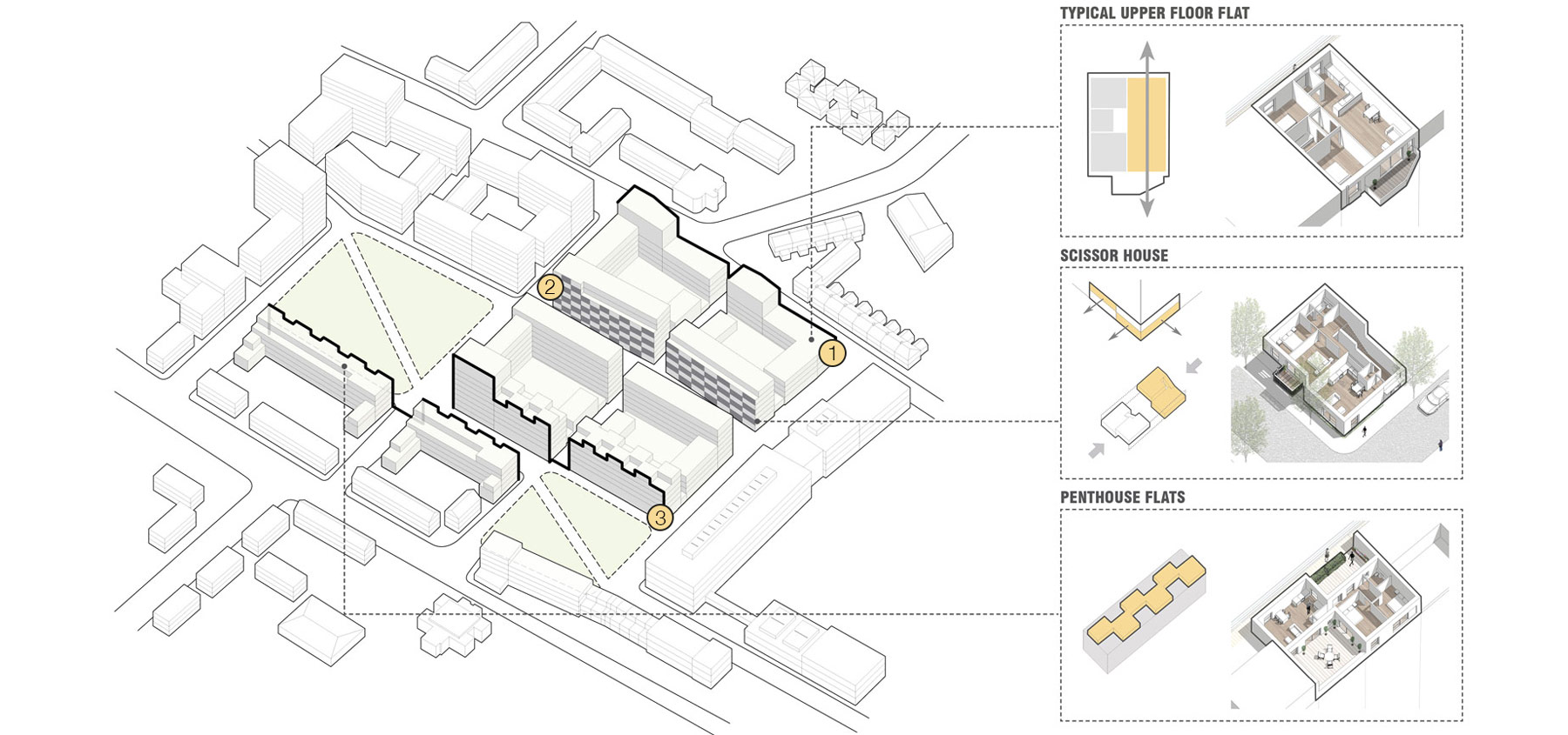 A grid of five new streets, organised around a sequence of six distinct buildings, has transformed the estate