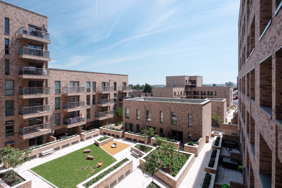 A large park sits in the centre of the estate, providing open communal amenity with paths through to the adjacent primary school (the largest in the country) and housing beyond. Play elements here reference the site’s history and courtyards provide varied communal space with areas for growing produce.