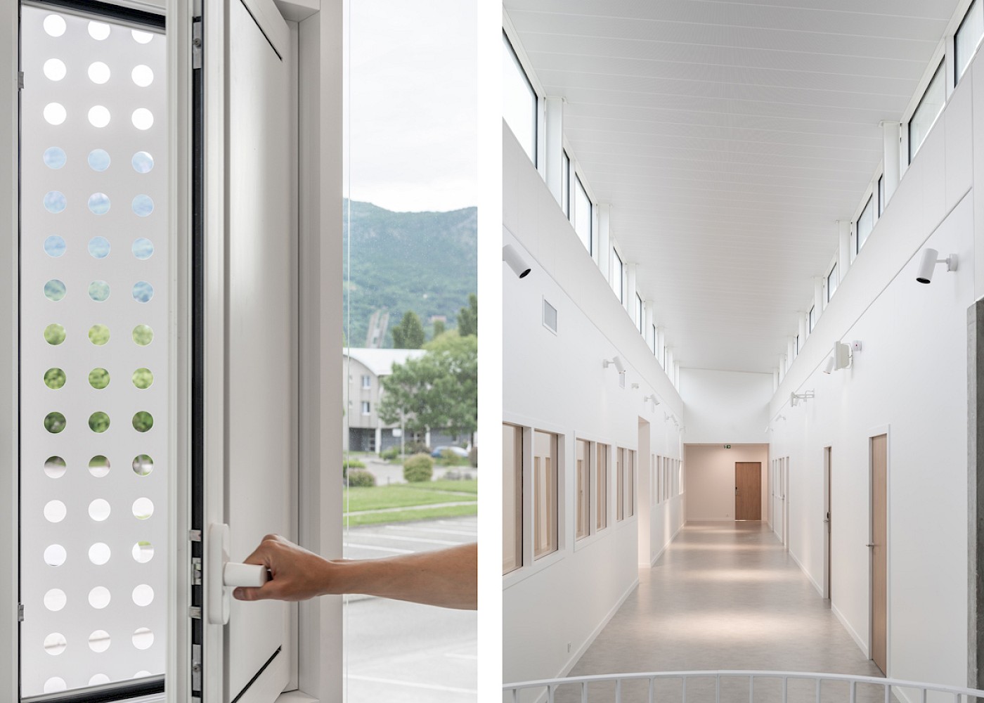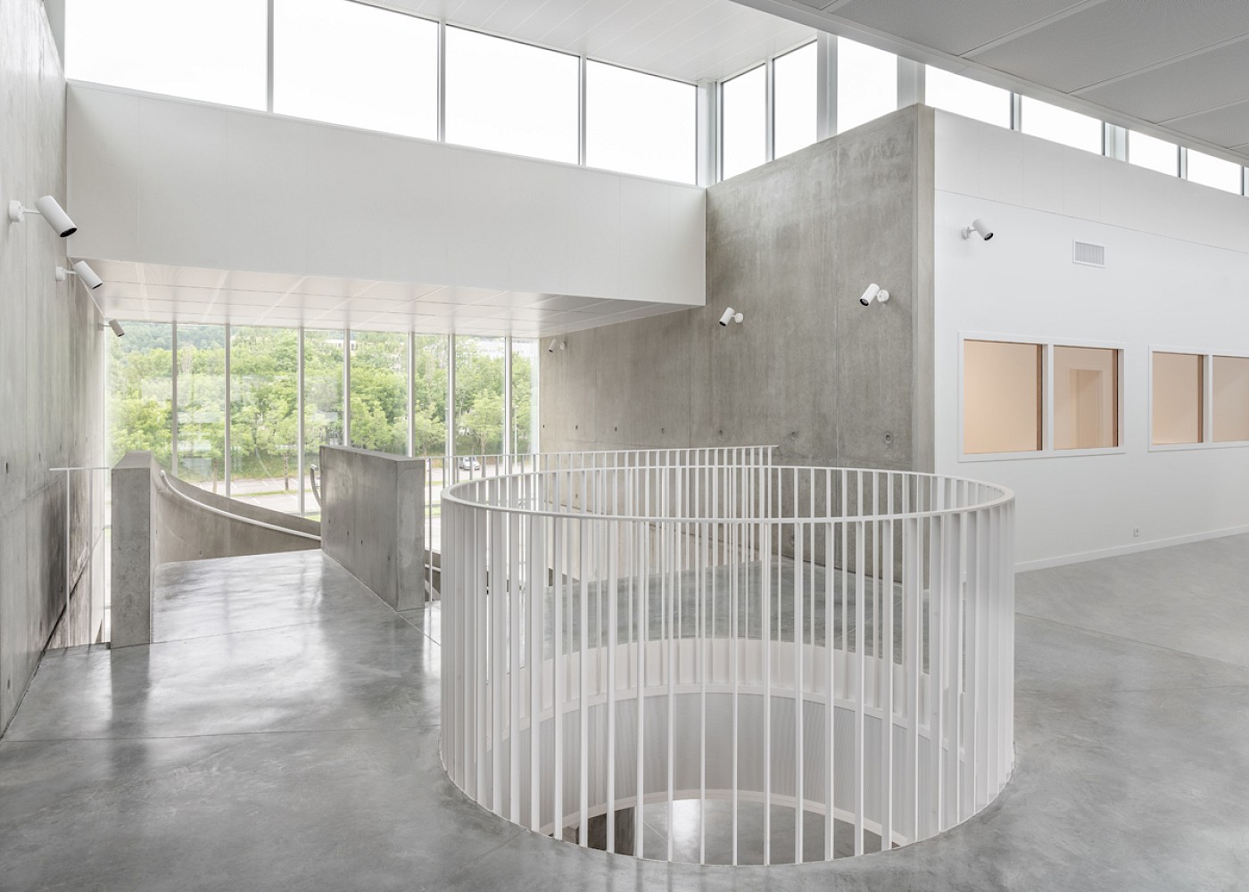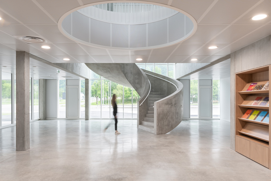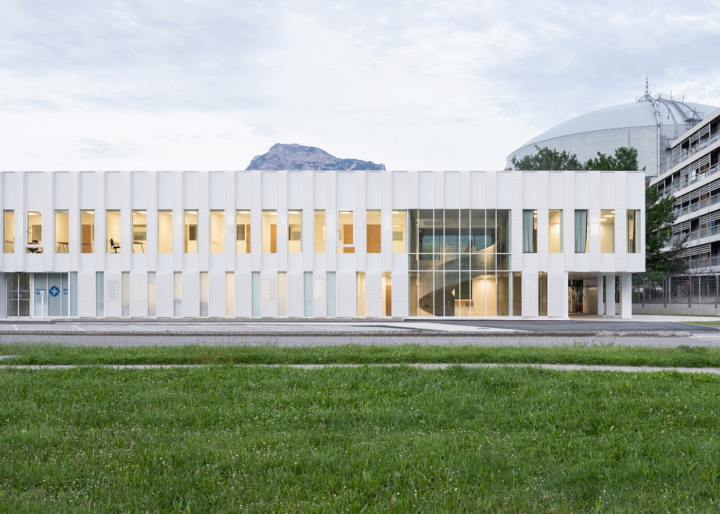 Conceived in two halves, the centre is split into public and private zones to balance accessibility with more secure functions. The new building has a delicate appearance, underpinned by a solid, muscular structure. Slender white perforated fins on the exterior modulate daylight and privacy and are arranged in a lenticular pattern inspired by the process of neutron diffraction. The fins alter the appearance of the façade, from morning to evening, during different weather conditions and when viewed from alternative angles. A singular skylight pushes its way through the roof of the building to provide natural light throughout the space.