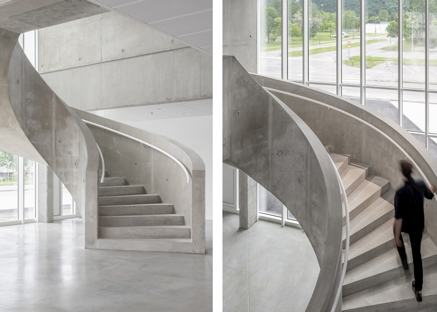 A helical concrete staircase connects the two floors whilst acting as a sculptural centrepiece