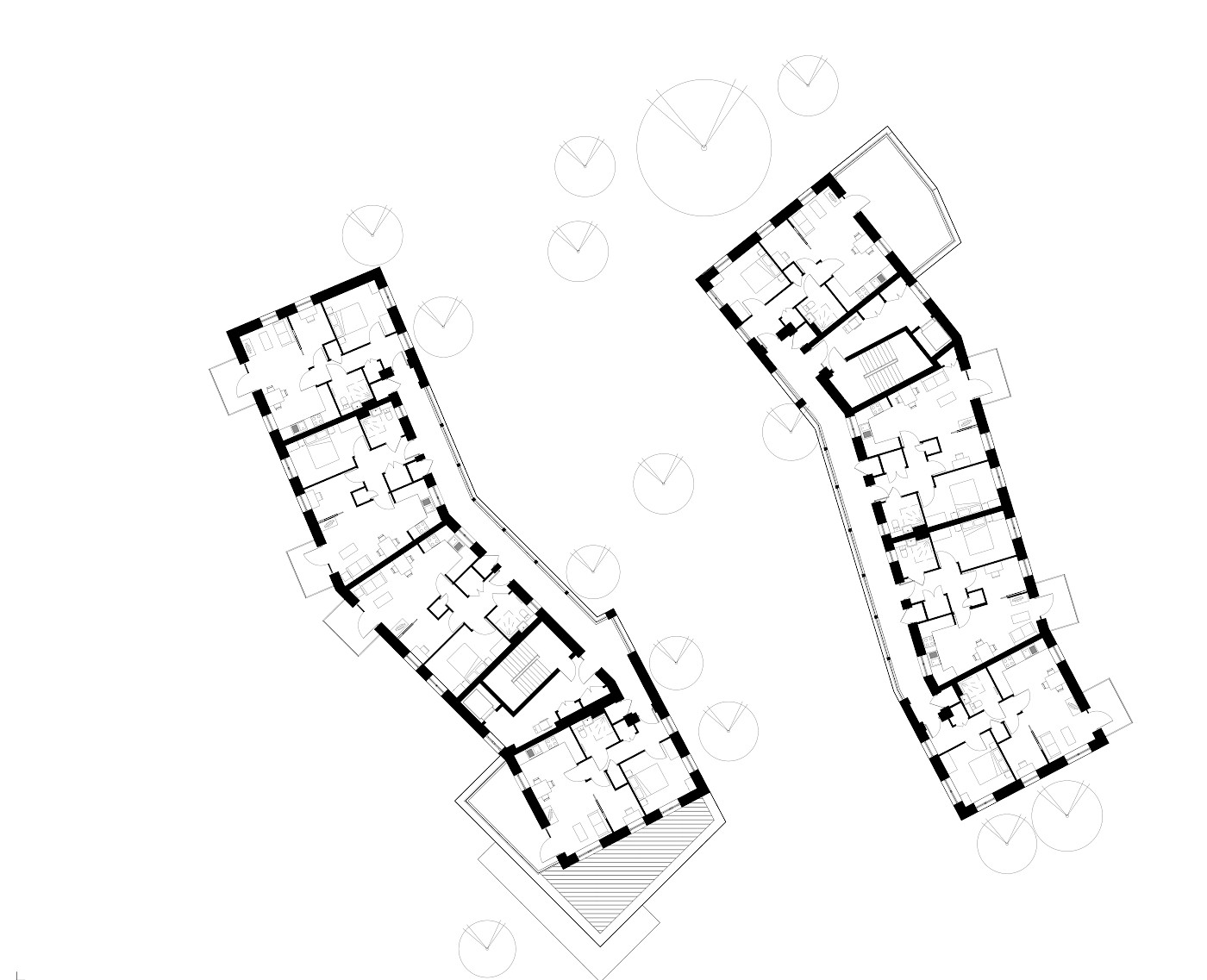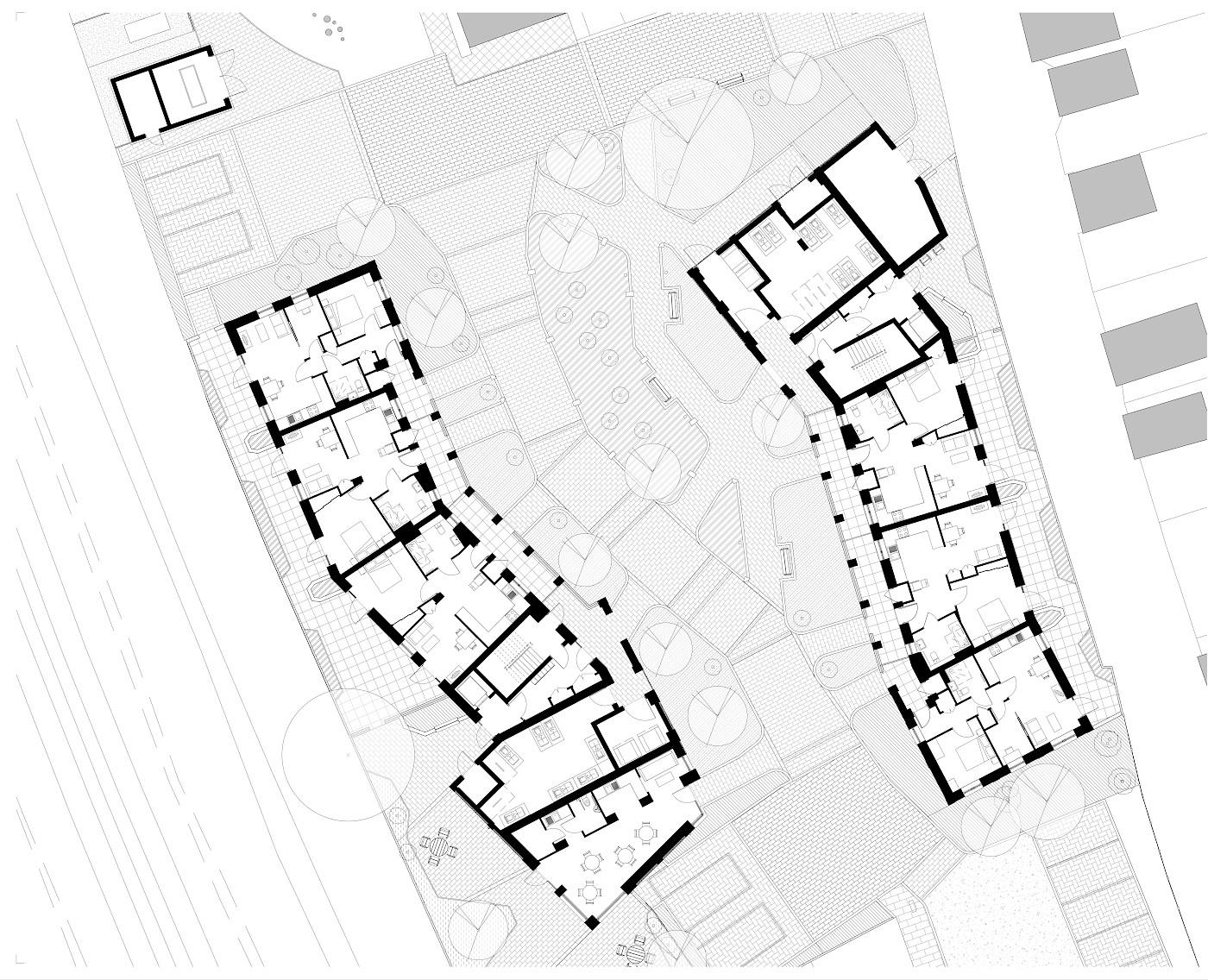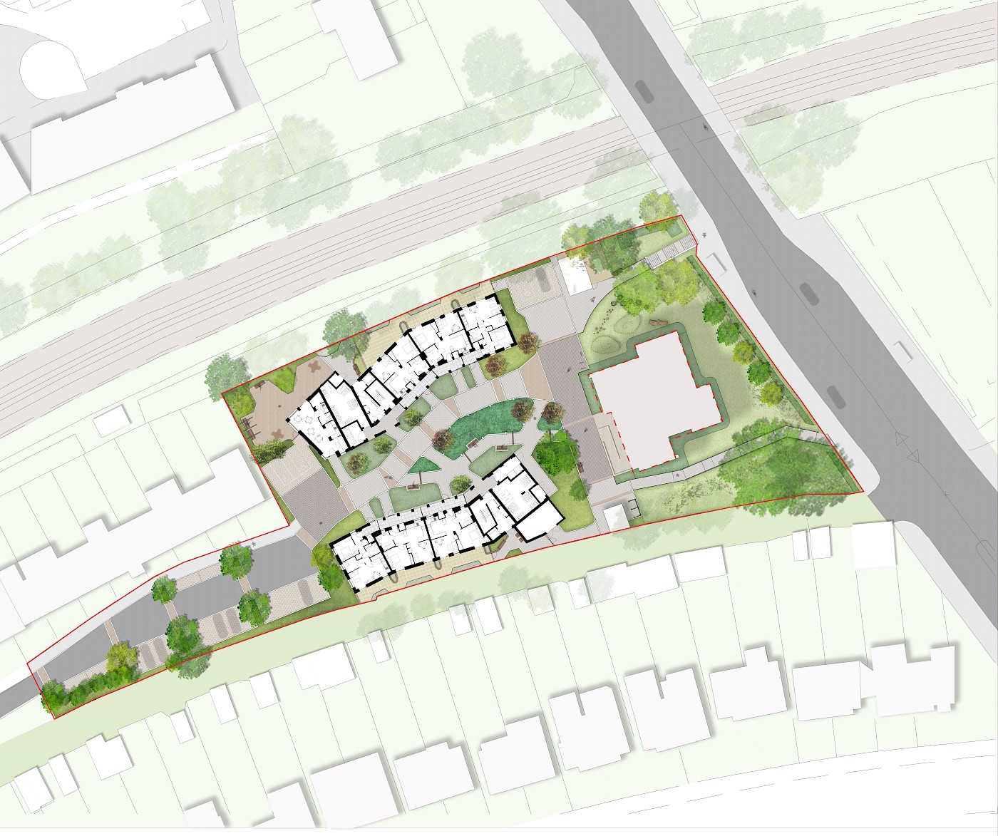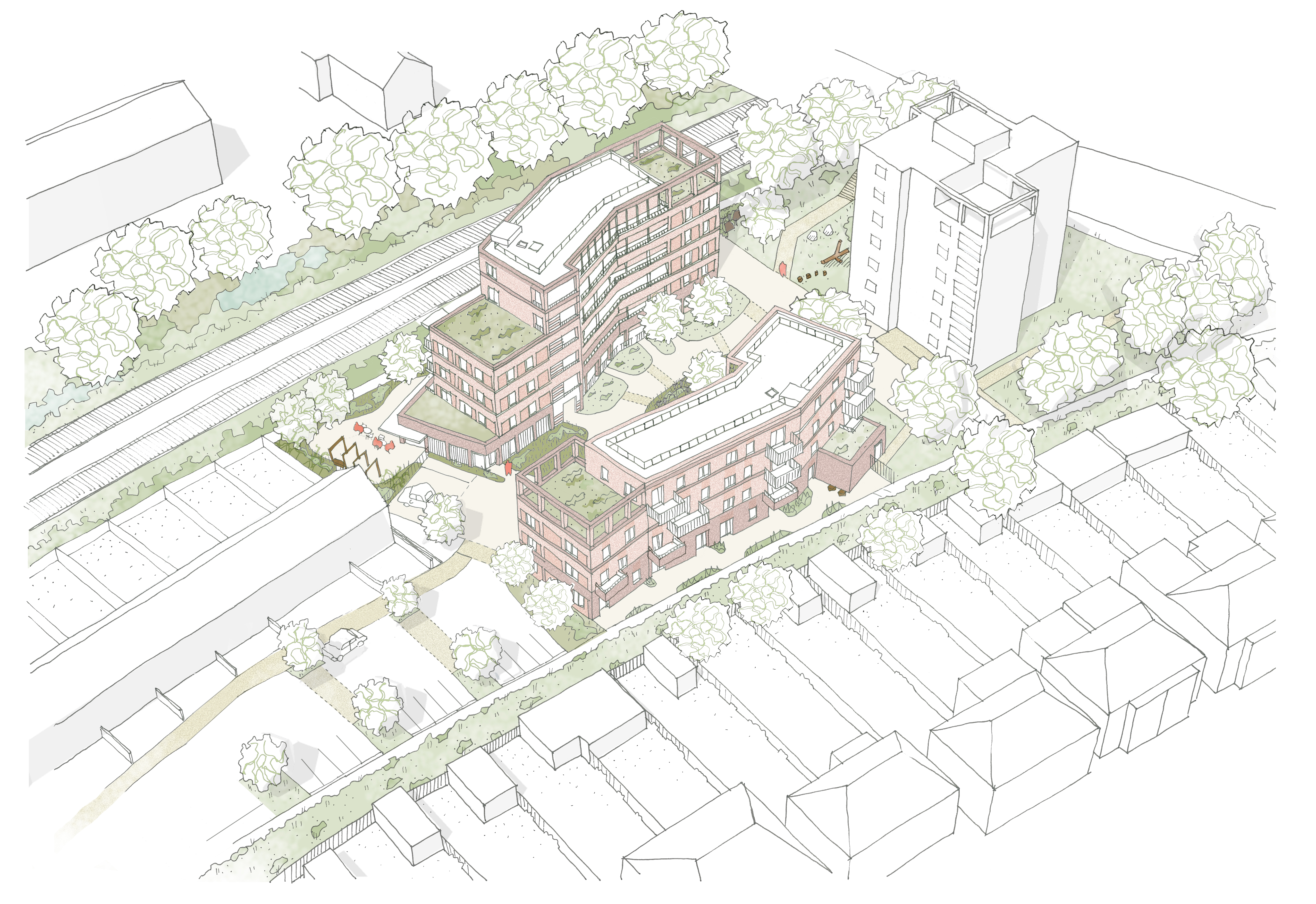 The design centres on people, comfort and connection. Two subtly cranked buildings create a pedestrian‑friendly central green space while retaining the well‑used route between Southend Lane and Beckenham Hill station. A communal garden room sits at the foot of the western building, extending into a protected green space for residents and visitors.