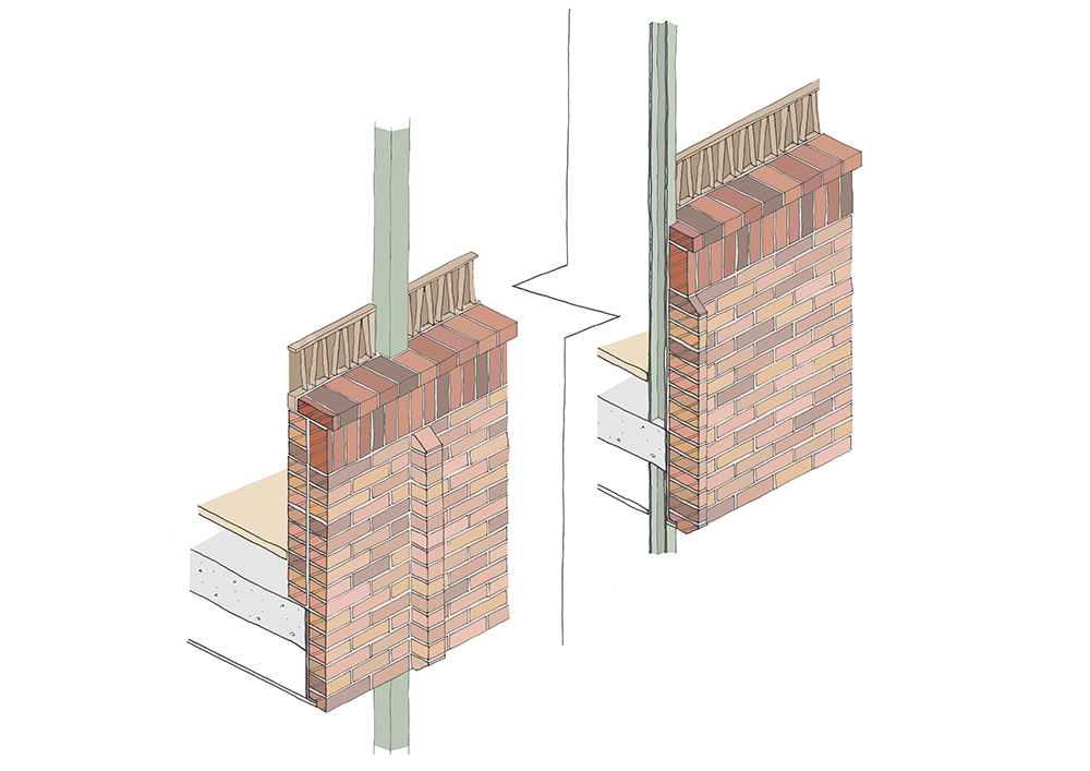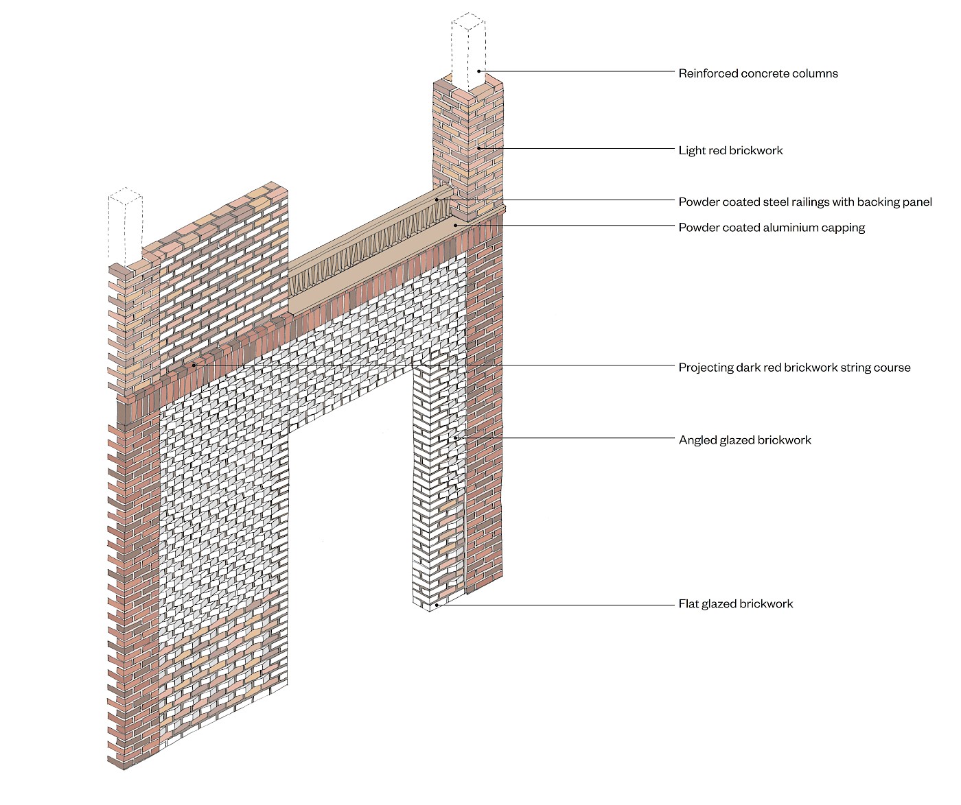 Brick banding, slight recesses, ribs and columns will add expression to the façades without adversely impacting the insulation layer in the wall build-ups. The new buildings pick up on subtle balustrade detailing from the adjacent tower, as well as reflecting the use of sky-frames to emphasize key corners, so the new interventions complement the existing.