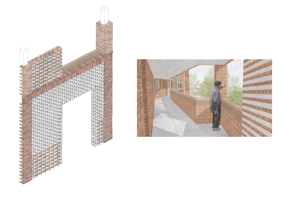 Main entrance and walkway detail featuring profiled glazed brick, and view along upper floor walkway