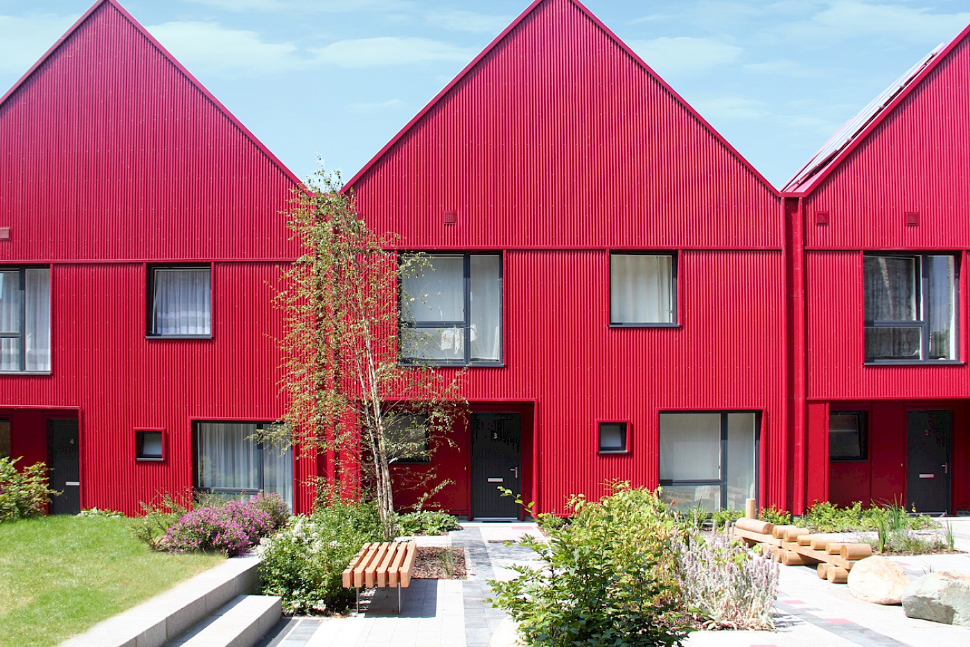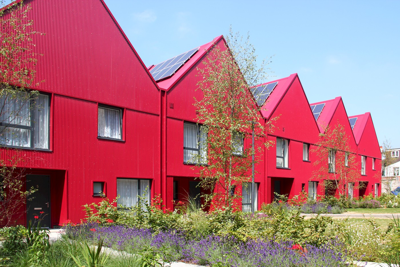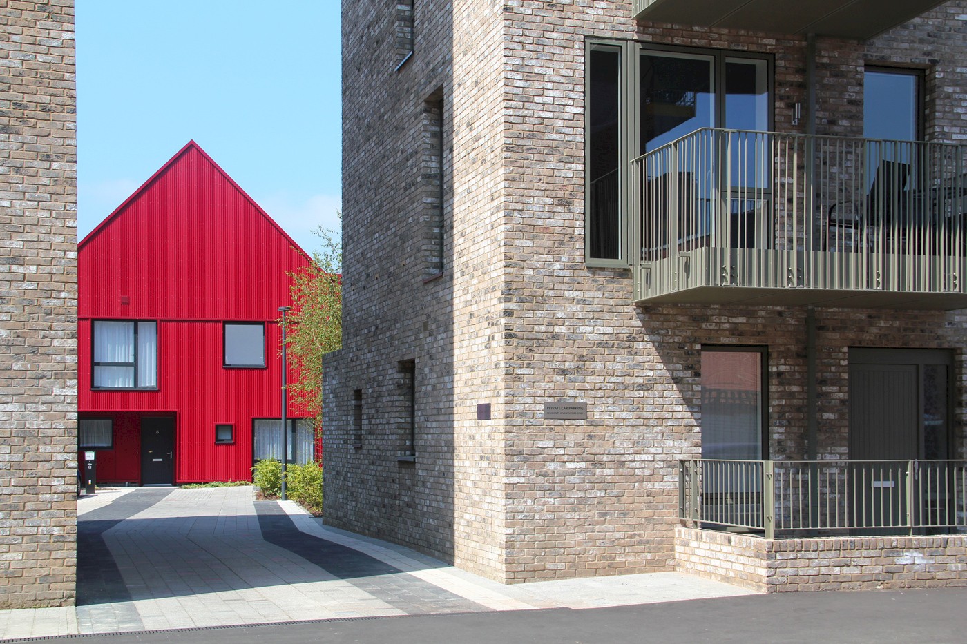 The courtyard form takes aesthetic cues from the industrial setting. The street elevation is wrapped in brick with a ‘random’ pattern of windows and balconies. Regular holes punched through give views of the courtyard, whilst the distinctive, irregular saw-toothed roof creates a sense of individuality. In contrast, the mews houses have a more traditional form, which is offset by the striking red corrugated metal cladding, playing on the industrial context and giving these houses a strong identity. Notably, all homes, whether one or two bedroom apartments or three bedroom mews houses, are affordable and dual aspect.