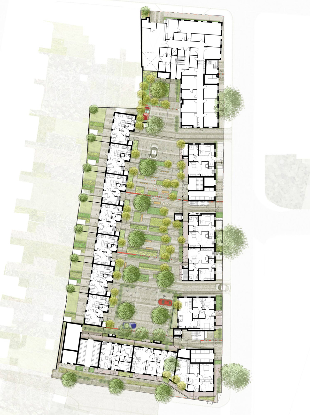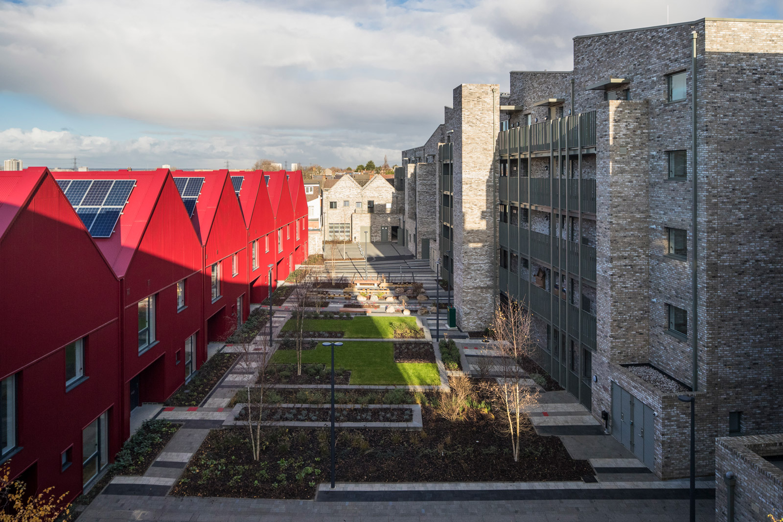 Designed as a cohesive whole, the scheme provides 59 new affordable homes, a shared communal garden and health centre.